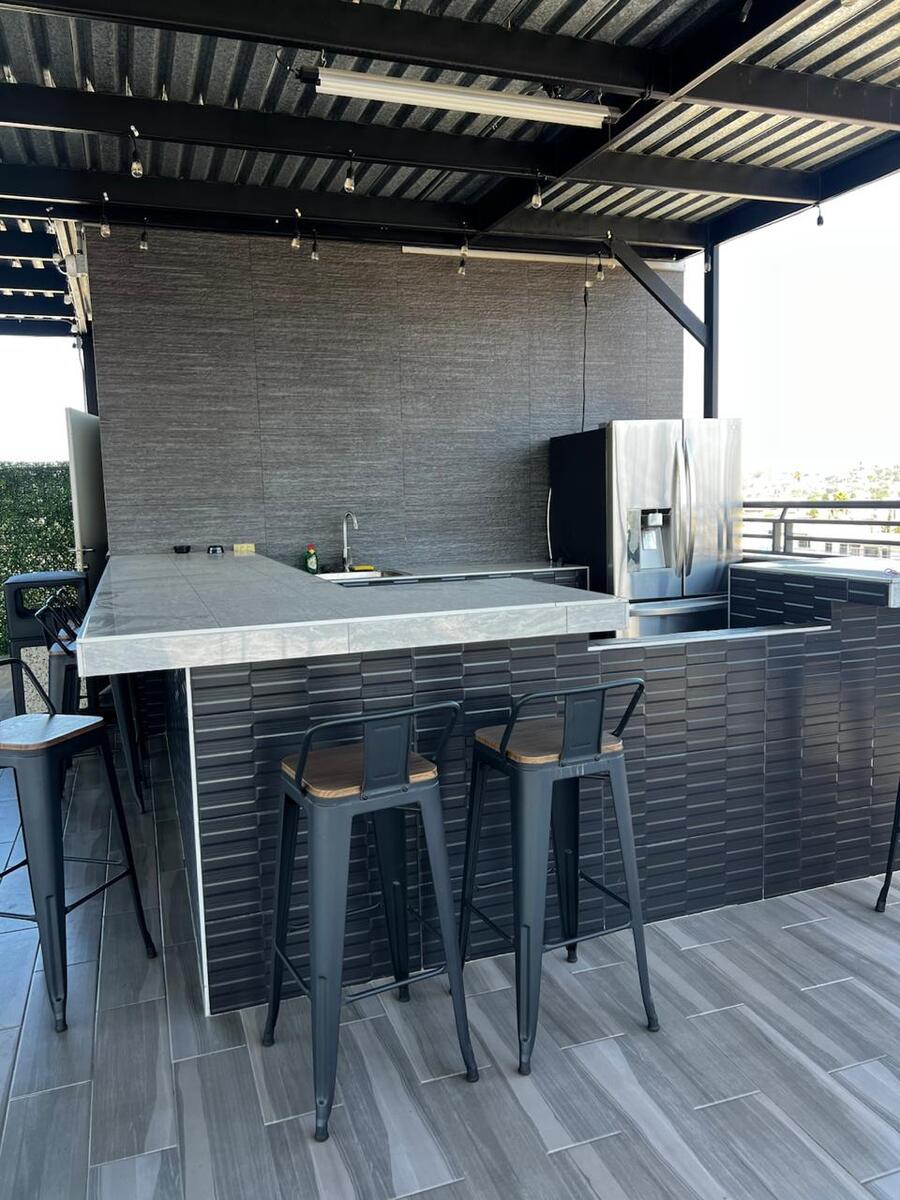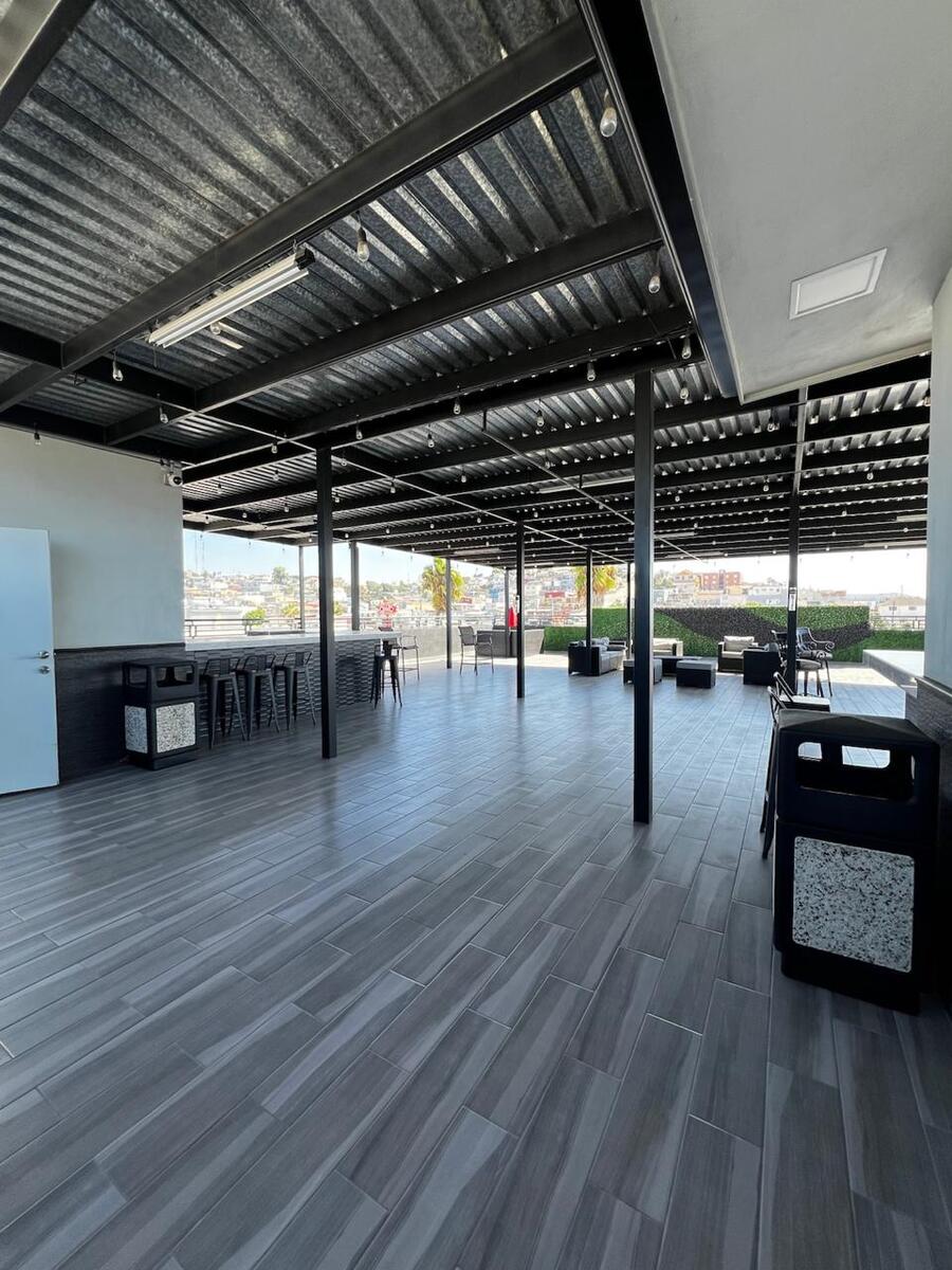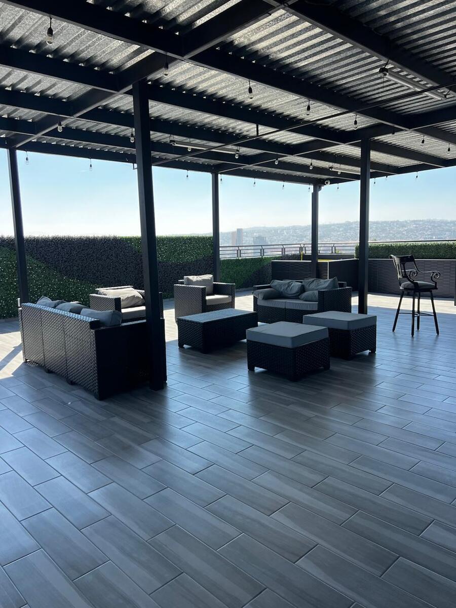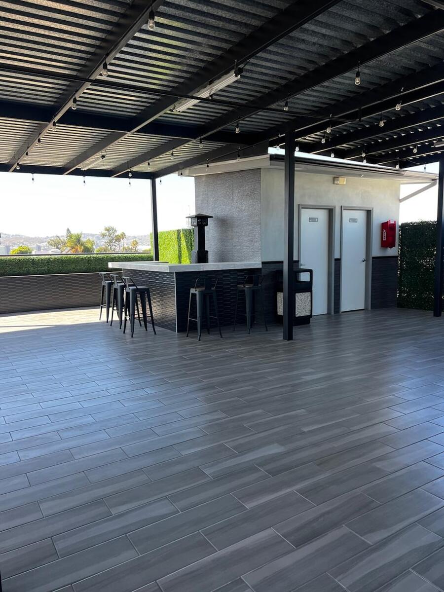 Roof garden con vista panorámica, bar, área de asador y baños.