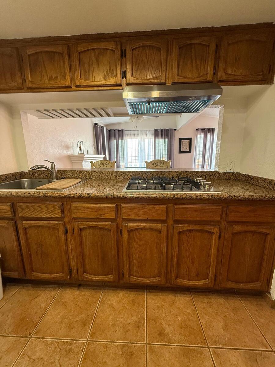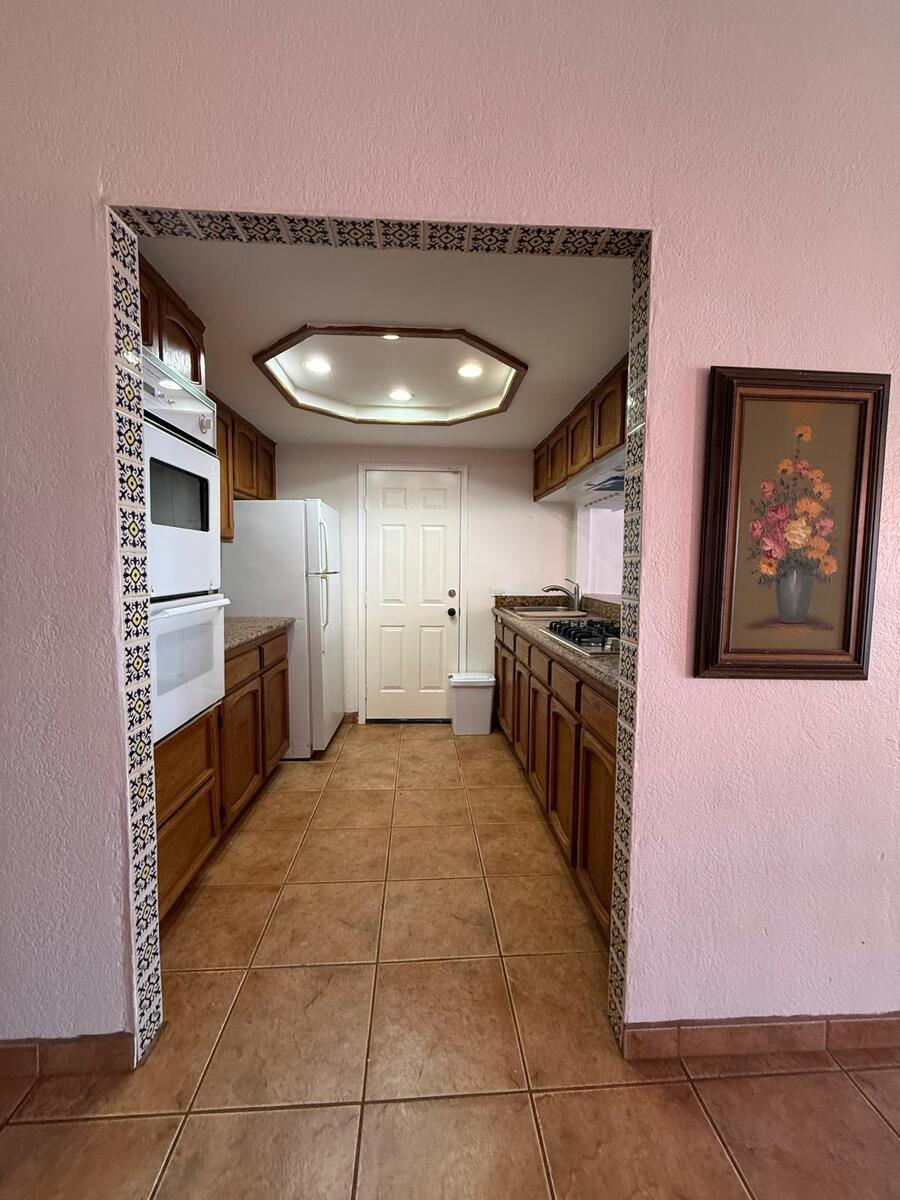 Galley-style kitchen with granite countertops, gas cooktop, and custom cabinetry—efficient and full of charm