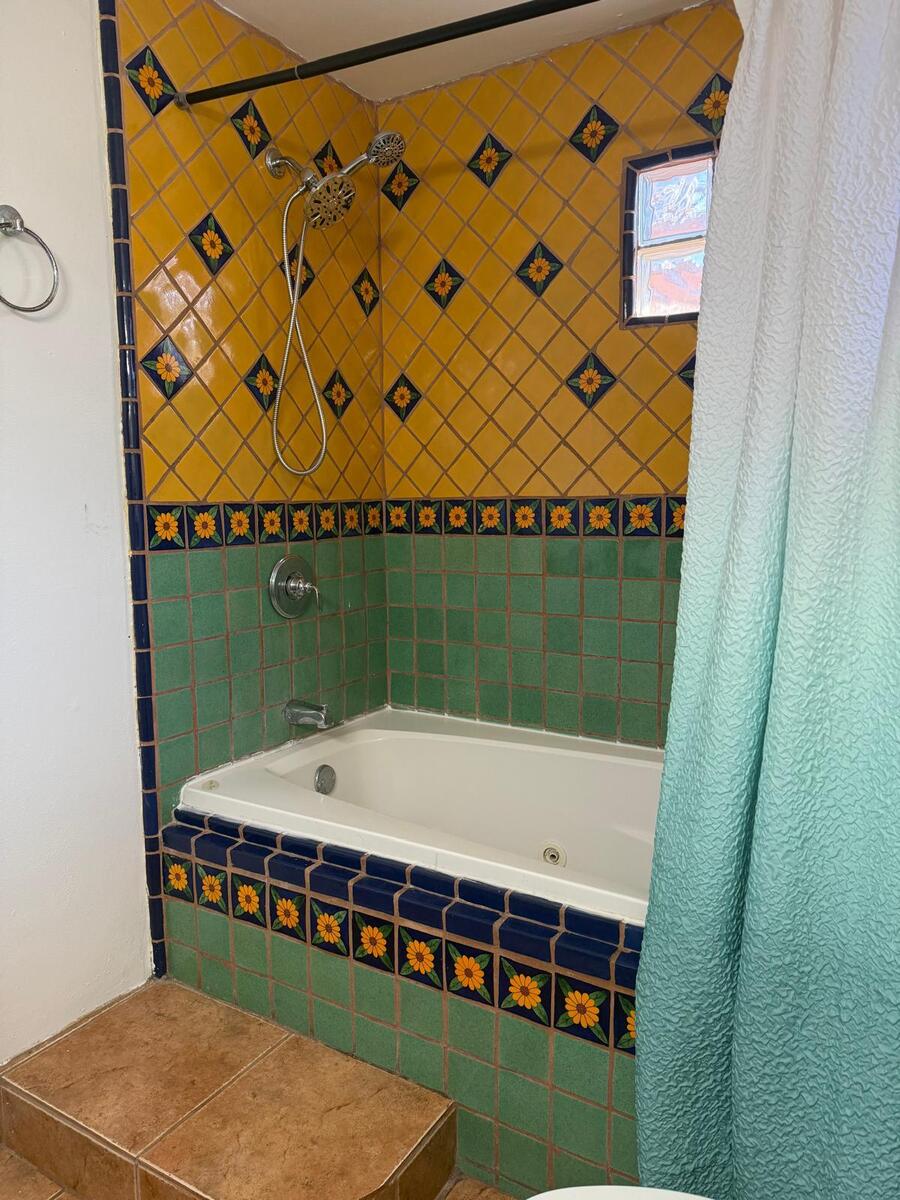Two full bathrooms, featuring colorful tilework, glass block showers, and artistic accents