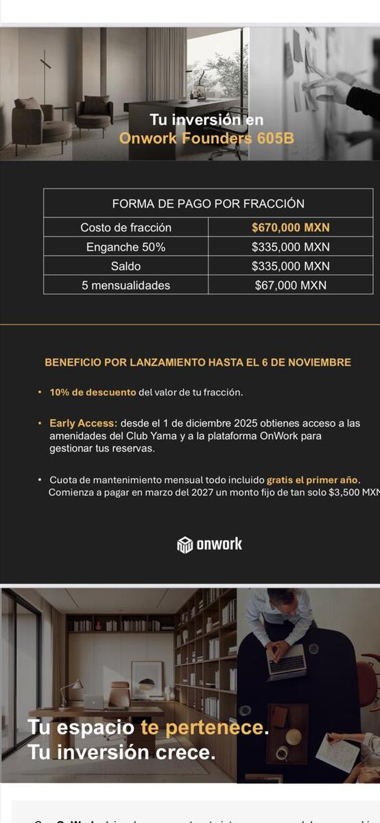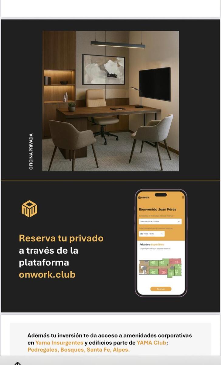 YAMA vende el concepto mas nuevo de Oficinas Premium Onwork, sobre Insurgentes y Reforma, super ubicación. Ejecutivo que requieres oficina ya no pagues renta adquierela y la puedes usar 10 horas a la semana o también la puedes rentar, con todas las amenidades que tienen los diferentes corporativos de YAMA, como Pedregal, Bosques, Santa Fe y Alpes.. $670,000, enganche del 50% y 5 mensualidades de $6i7,000. !!Unica Oportunidad¡¡ comunicate