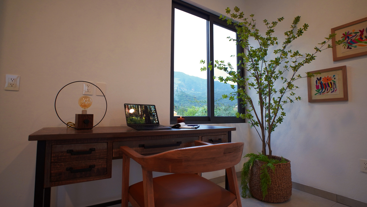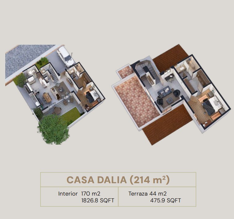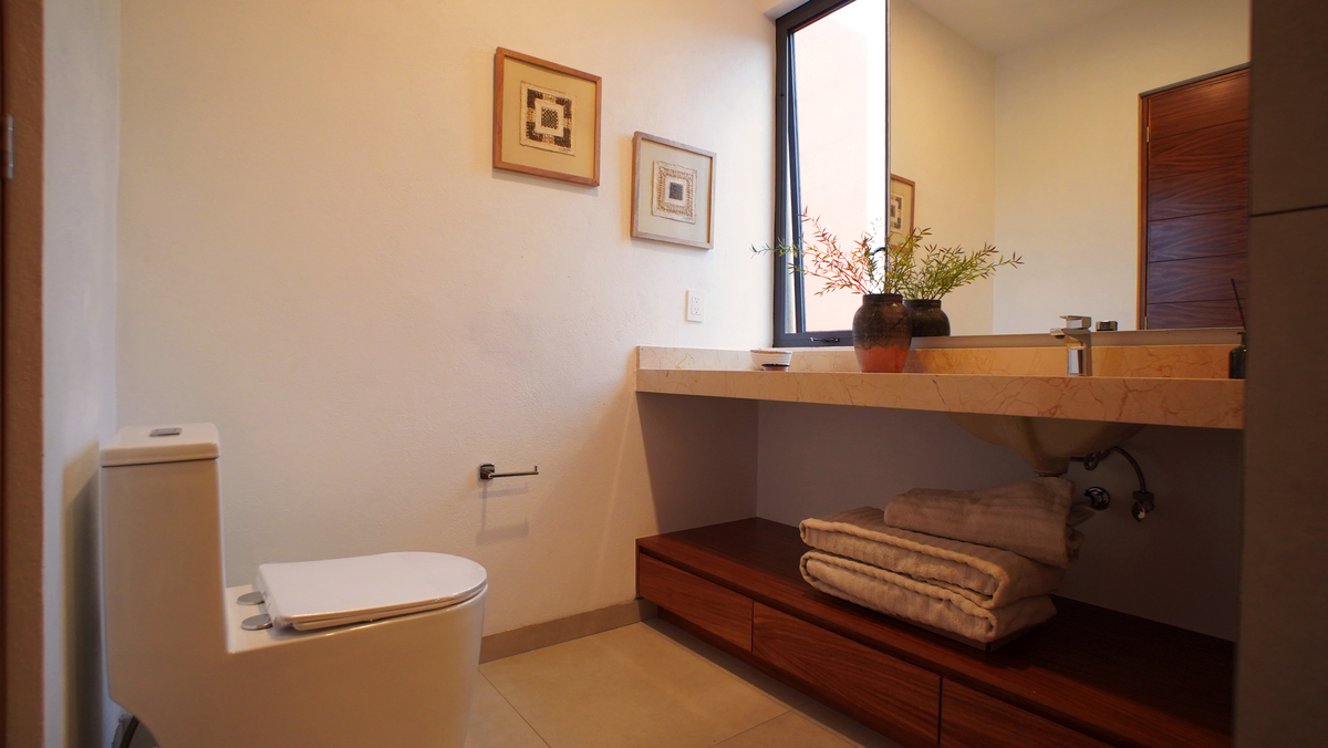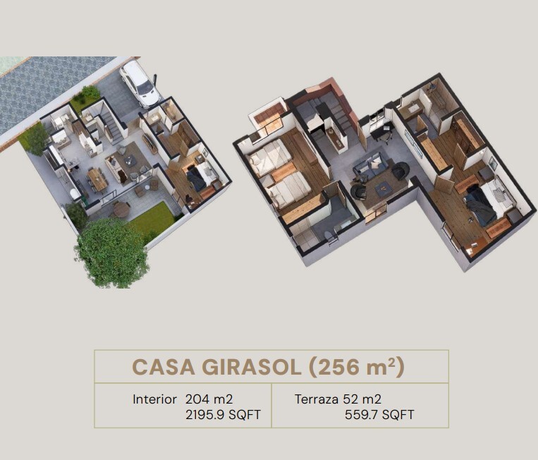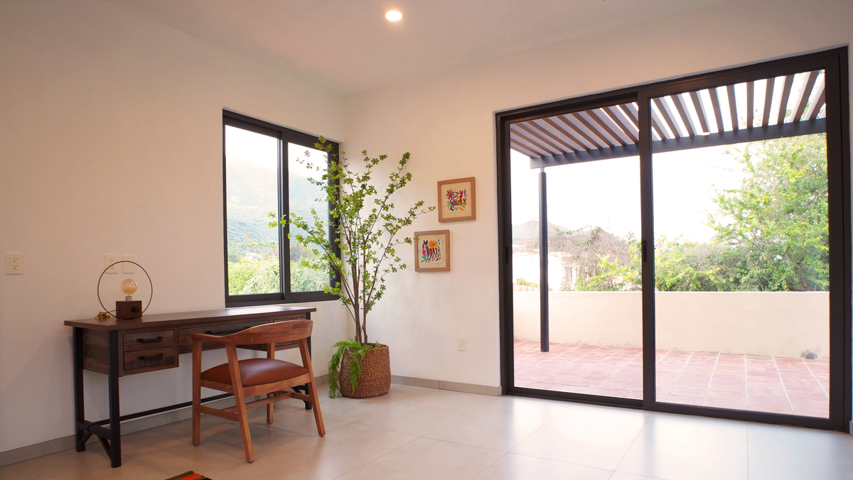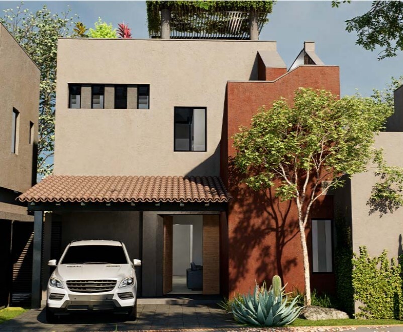 Todas las casas tienen una recamara con vestidor, baño y terraza en planta baja, un grande espacio privado aireado e iluminado para oficina o sala de TV común en planta alta.