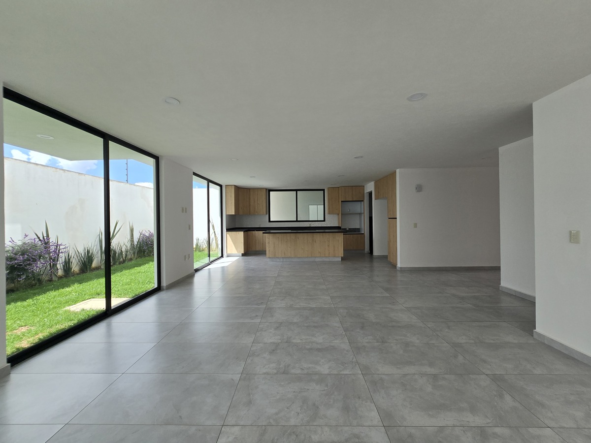 Comedor y sala amplios con conexión visual hacia el jardín trasero.
