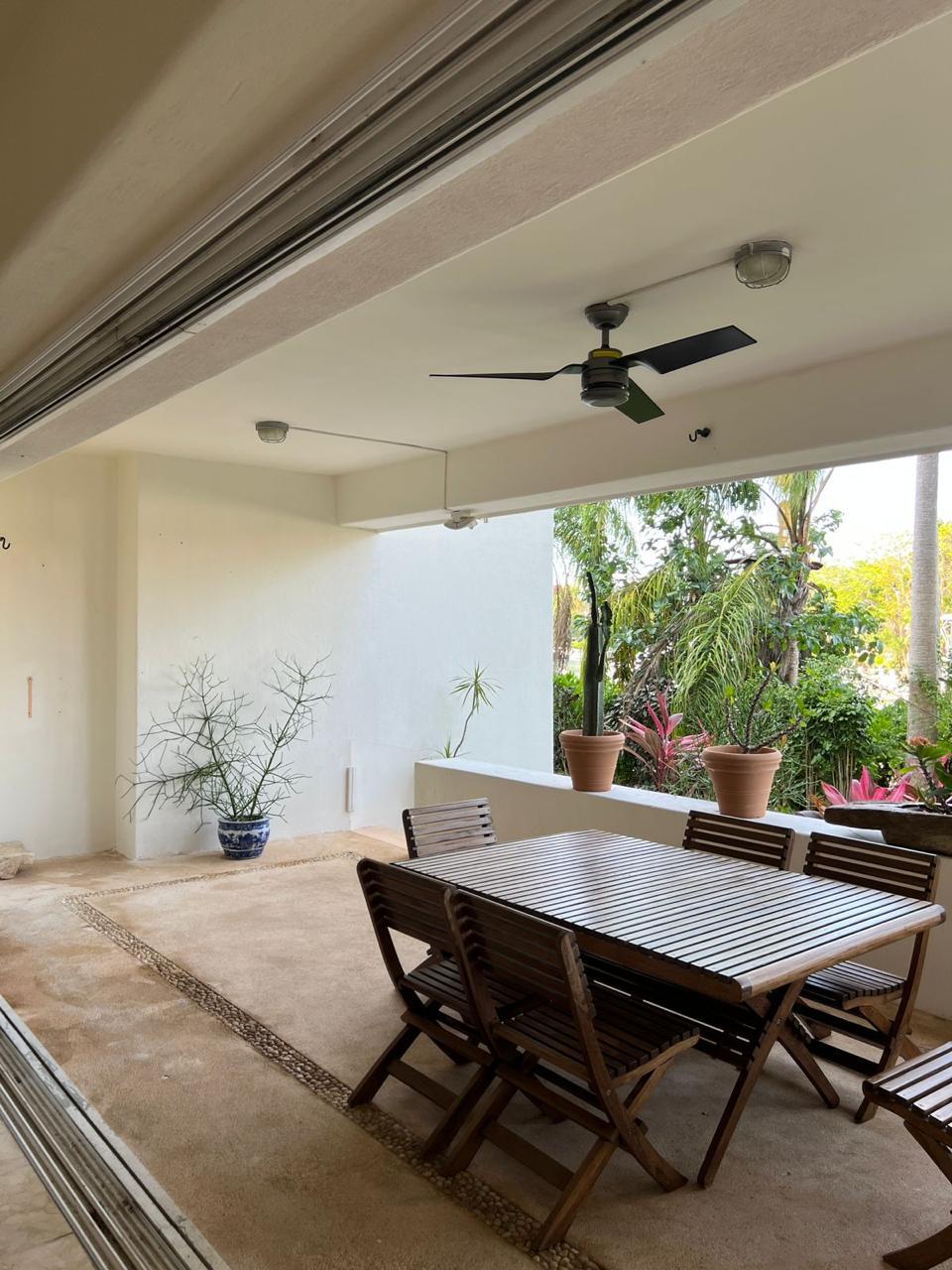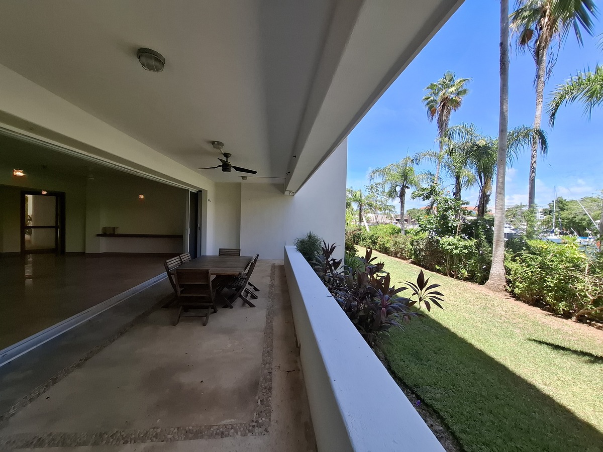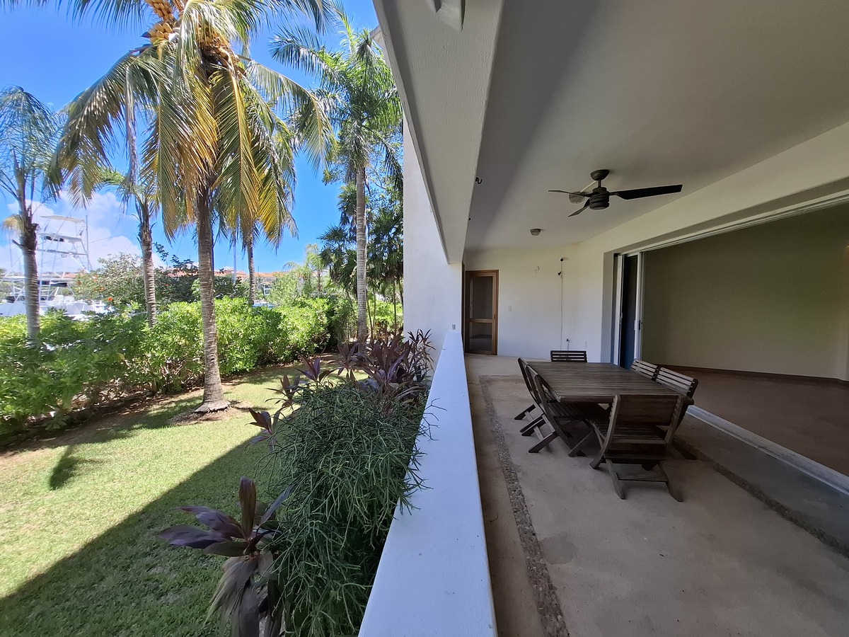 The apartment is located on the ground floor of the attractive Chac Hal Al condominium. This 173 m2 property has everything you need. It has 2 bedrooms each with its own bathroom and private balcony. Large kitchen with window to the garden, a half bathroom for visitors, a spacious social area for the living room and dining room with large sliding door windows that go from ceiling to floor that lead to the beautiful terrace with views of the marina and boats. The property has A/C and ceiling fans.