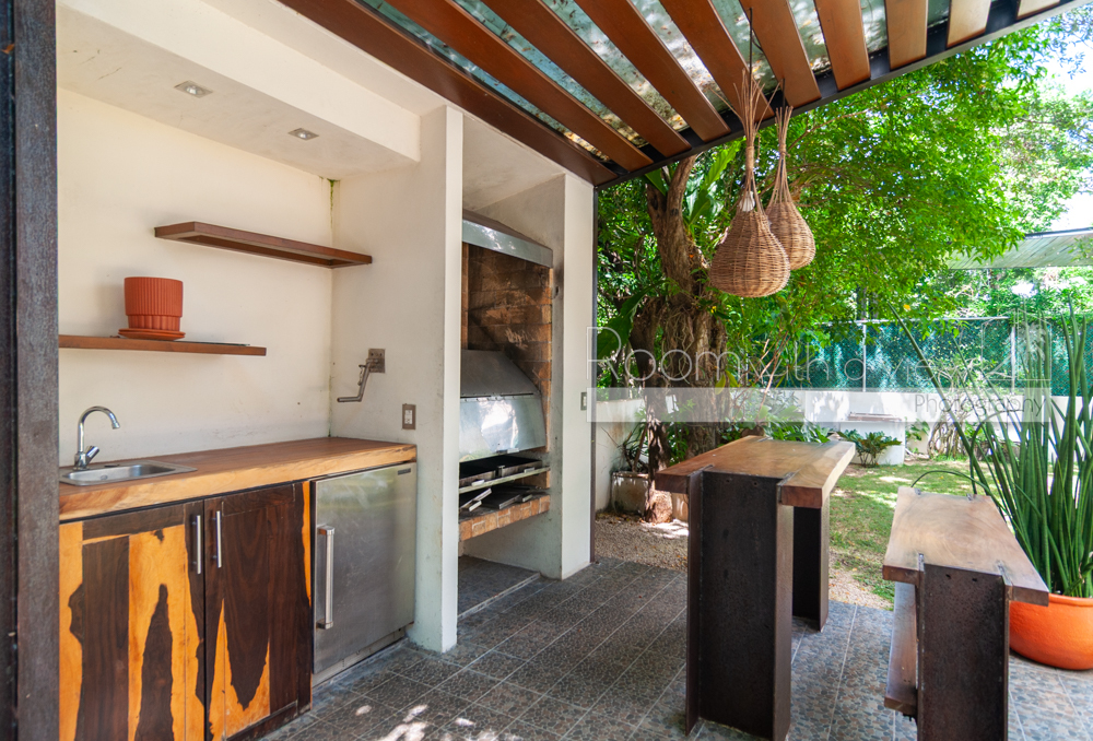 En el piso superior, el rooftop que rodea la casa ofrece vistas a las copas de los árboles. Es un lugar acogedor para entretener a los huéspedes o relajarse con una bebida y un libro. También cuenta con una regadera en el exterior para refrescarse en los días más calurosos.