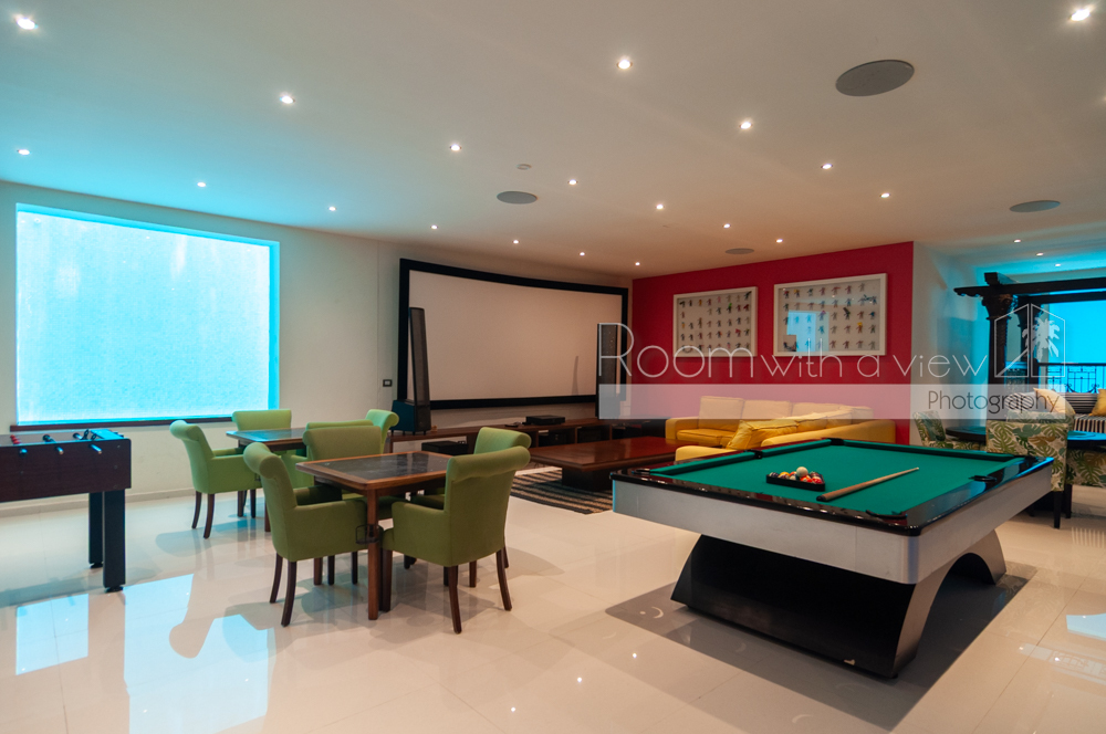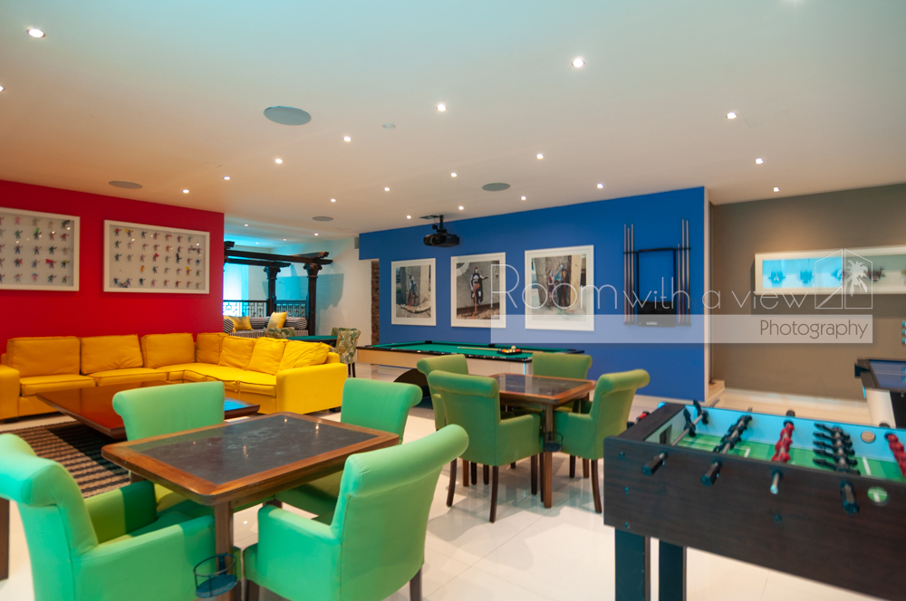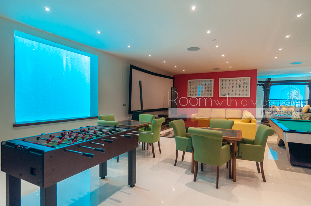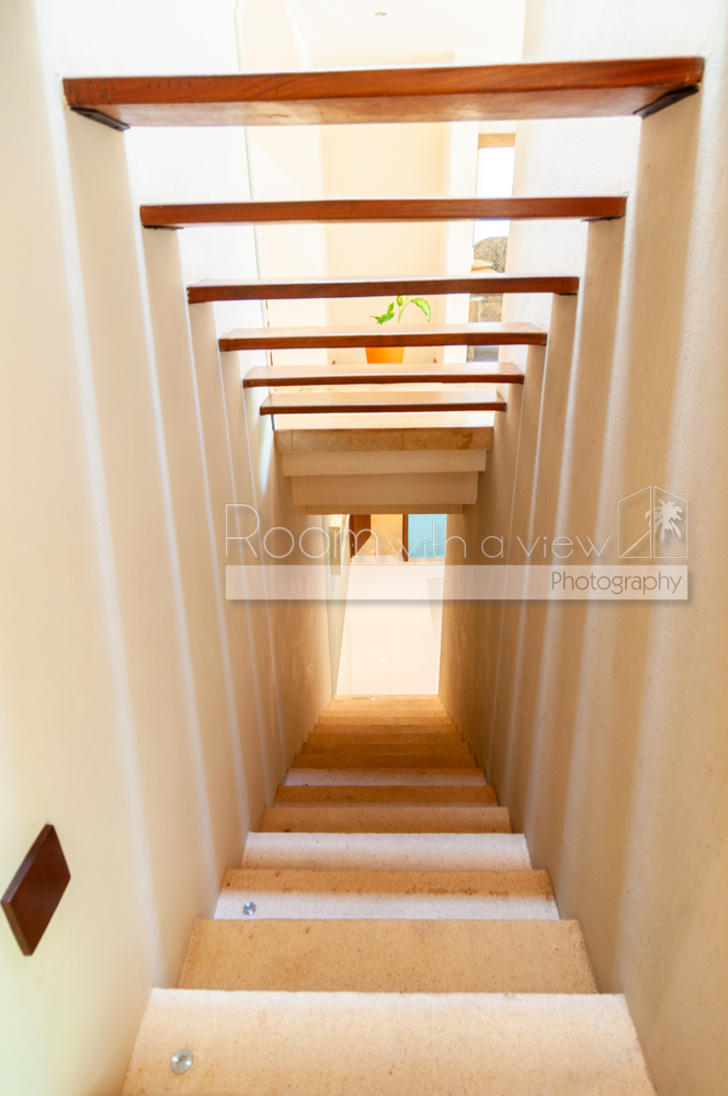 Wooden stairs connect the three levels of the house. On the ground floor, a TV room, bar and games room provide an entertainment sanctuary. There is also a small living room with natural lighting in the main lobby.