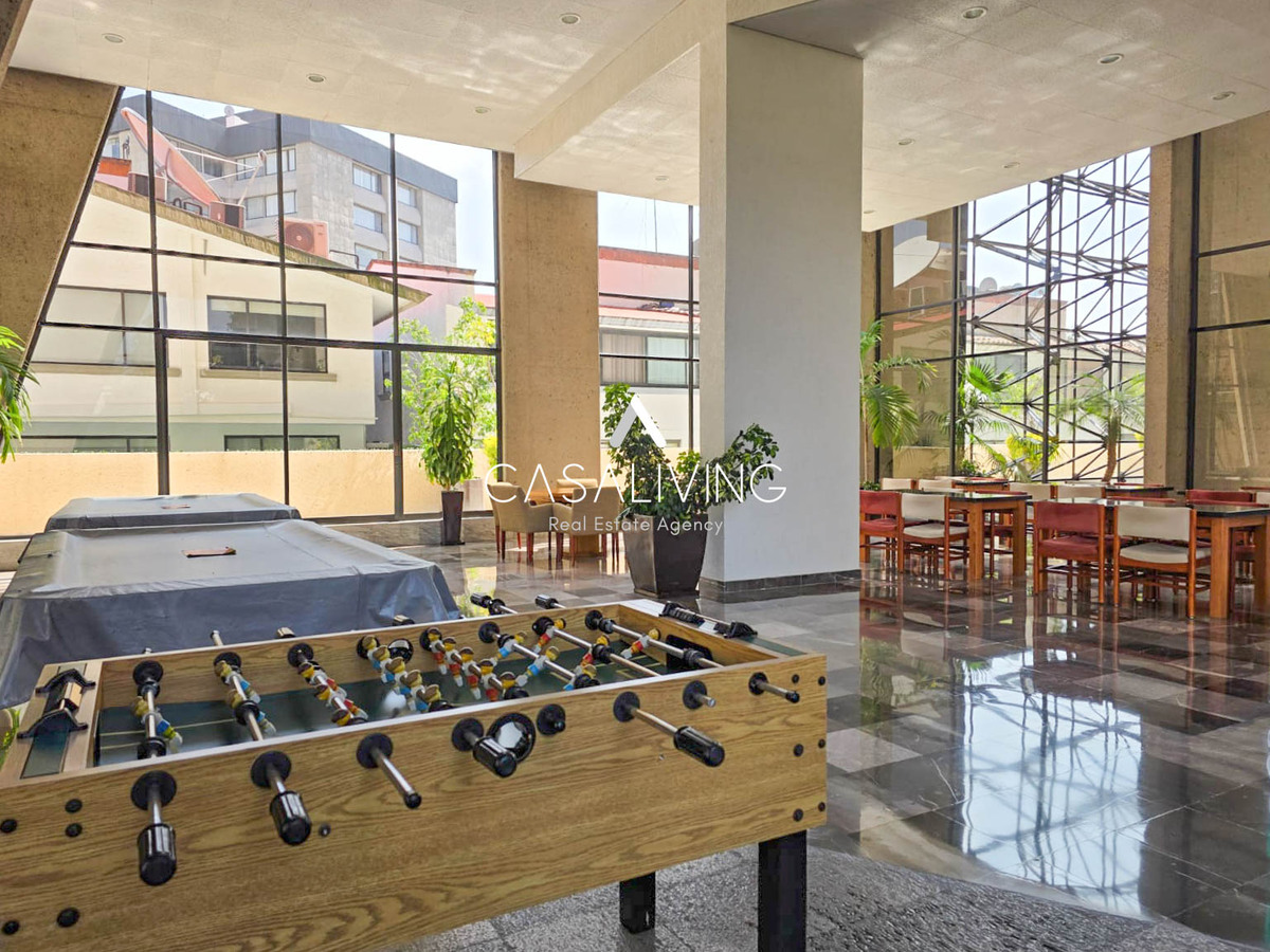 El edificio cuenta con alberca, gimnasio, amplio jardín, salón de eventos y un área social. Terraza techada con asador junto al jardín. Estacionamiento para 2 autos y vigilancia 24/7.