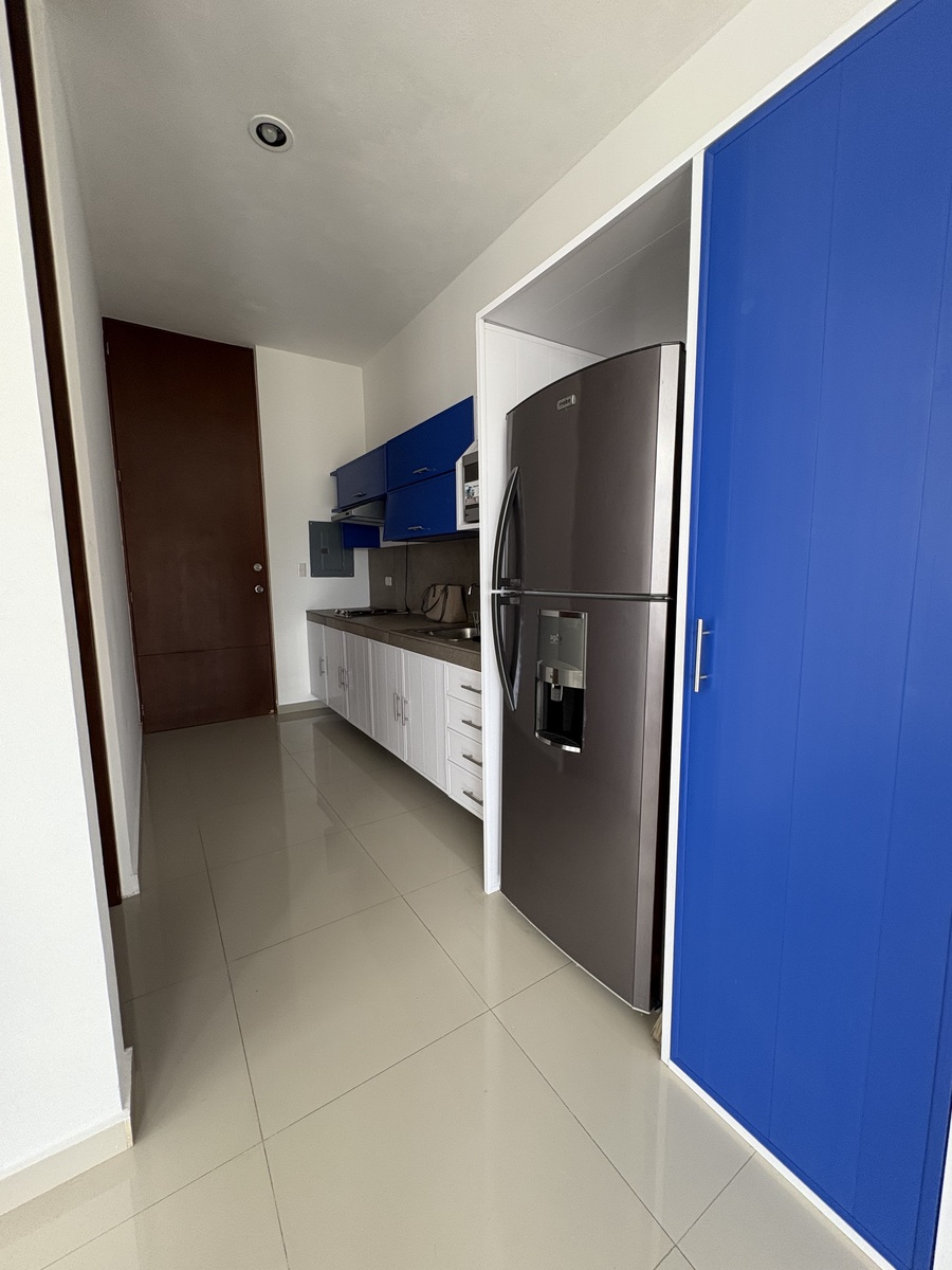 1 recámara con un balcón, cocina, baño, 1 lugar de estacionamiento techado. Climatizado en estancia sala, y en la recámara. Persianas . Closet amplio. Incluye pago del mantenimiento mensual.