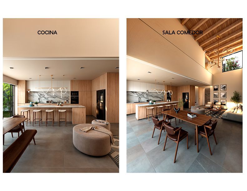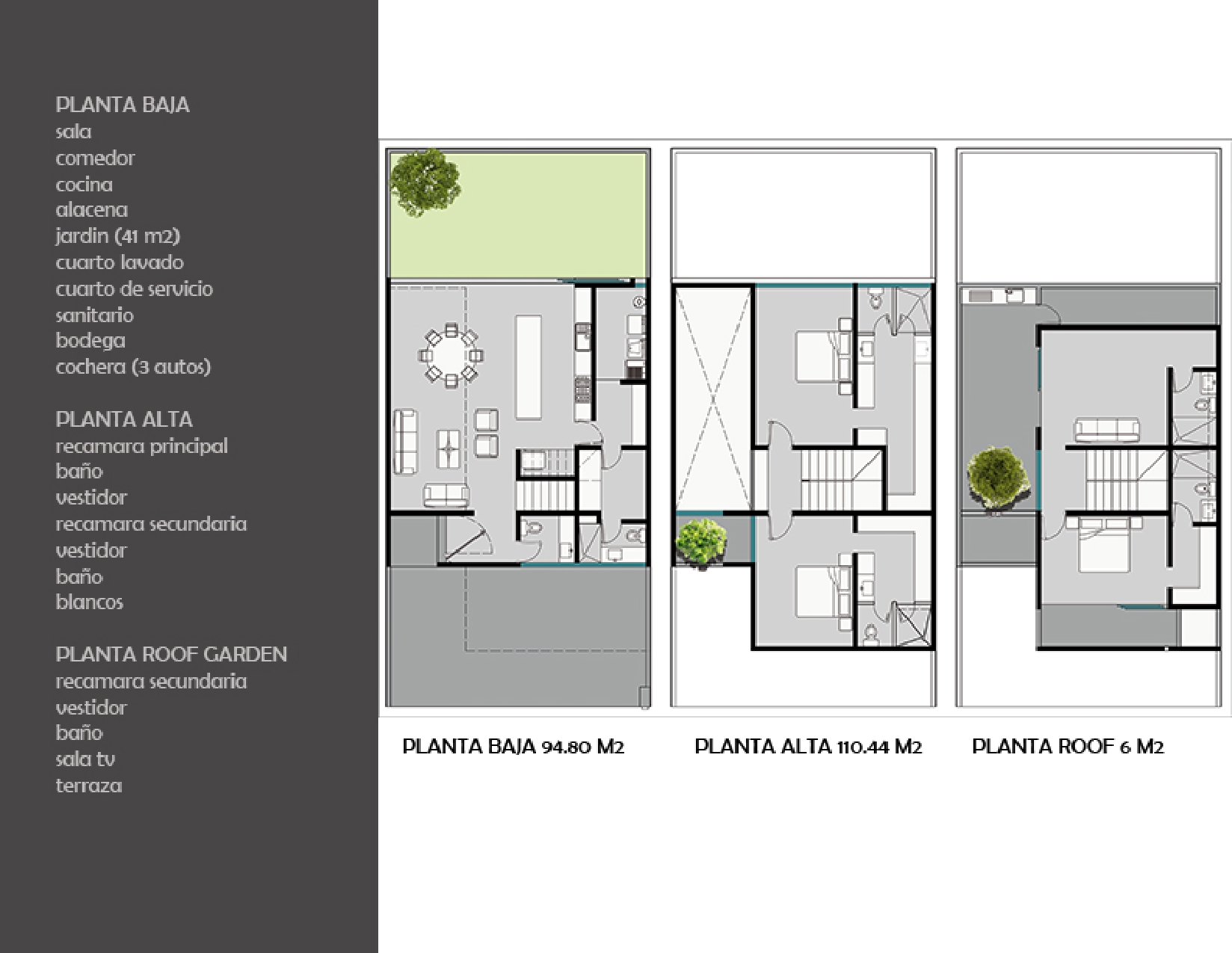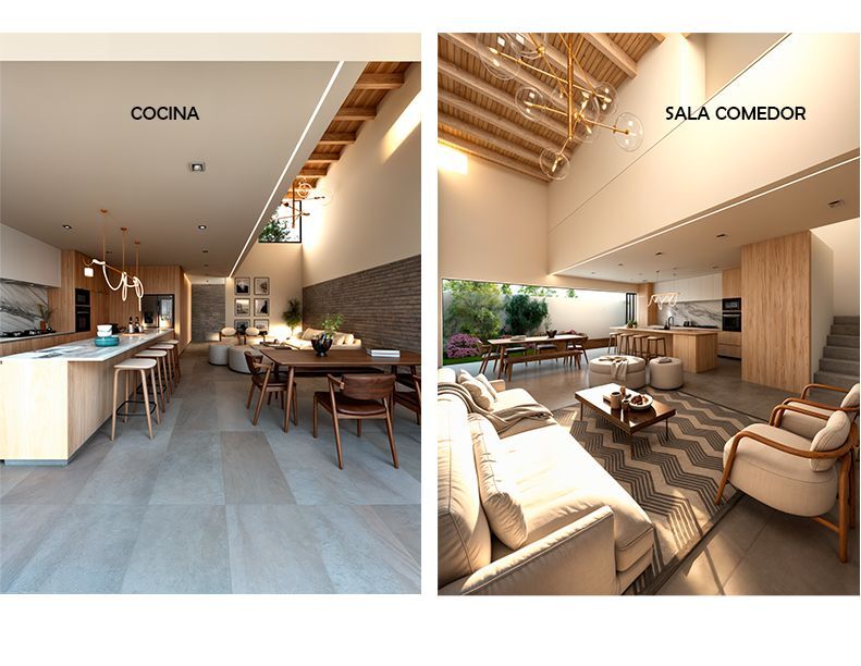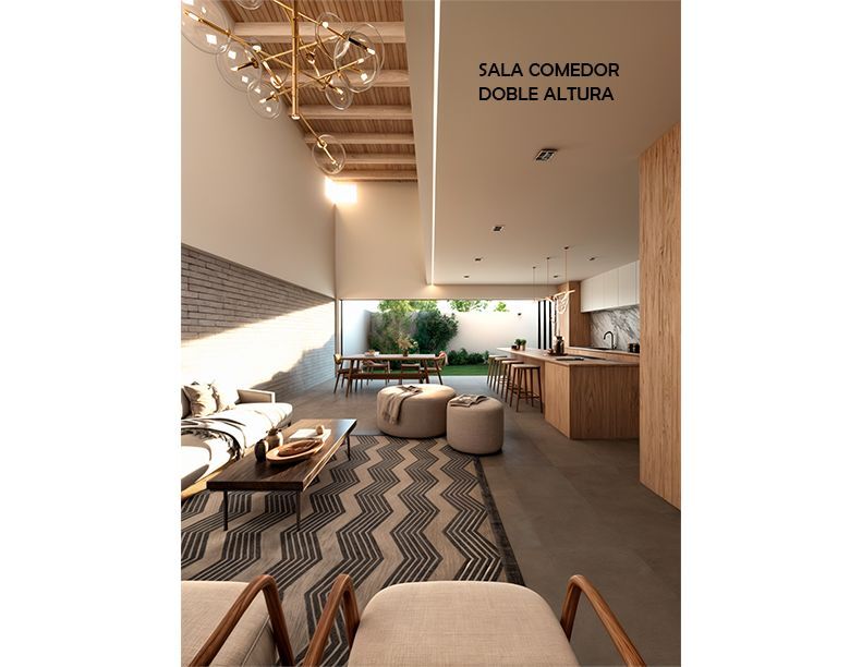 Planta baja: 1/2 baño, sala a doble altura, comedor, amplia cocina con barra y alacena, jardín de 41 m2, cuarto de lavado, cuarto de servicio con baño, cisterna, 3 autos