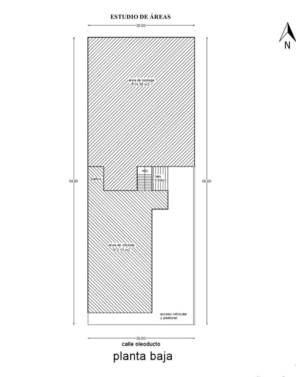 vestíbulo para personal, al interior cuenta en área de oficinas con módulo de vigilancia, baños, tres privados, una sala de juntas, área de oficinas abiertas y escaleras. En planta baja en el área de oficinas cuenta con cubo de escaleras, vestíbulo de distribución, dos módulos de baños y un área de almacén. En un cuerpo aparte adosado a las oficinas se encuentra la bodega con un módulo de baños.