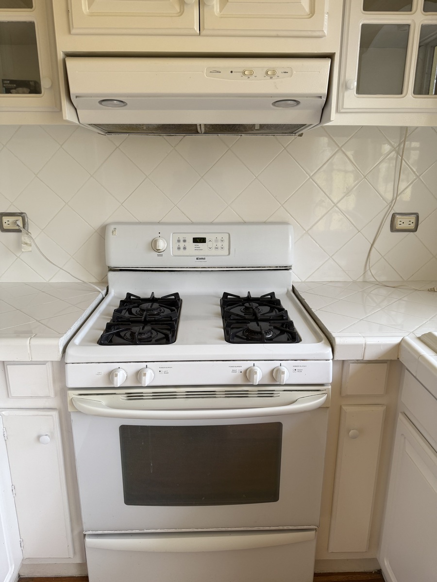 ๐ฝ๏ธ White integrated kitchen with stove, hood, refrigerator, microwave, double sink, modern faucet, and beautiful hanging lamps ๐ก