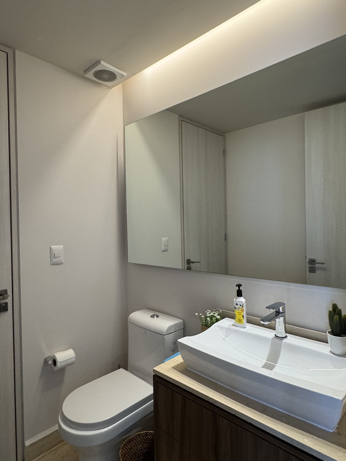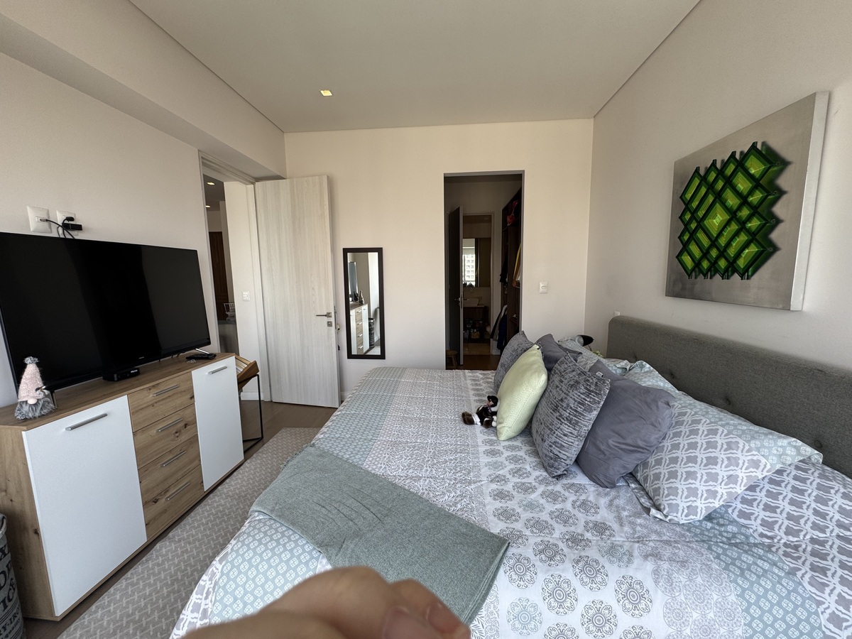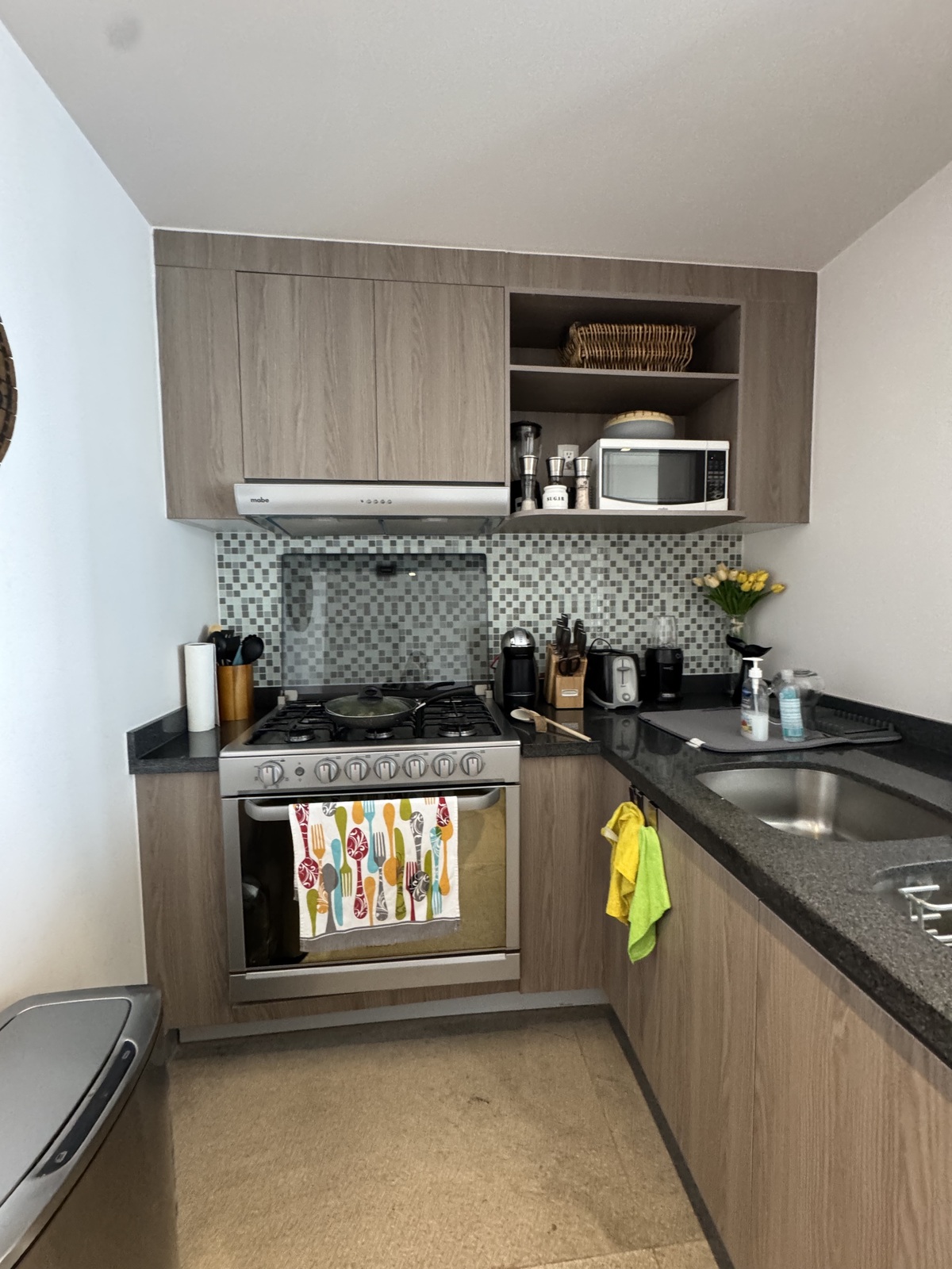 Tiene 2 recámaras, la principal con vestidor y baño y la segunda recámara comparte baño con visitas. Tiene espacio para sala y la cocina es abierta con cubiertas de granito . Es piso alto. Tiene 2 balcones uno en la sala y el otro en la recámara principal.