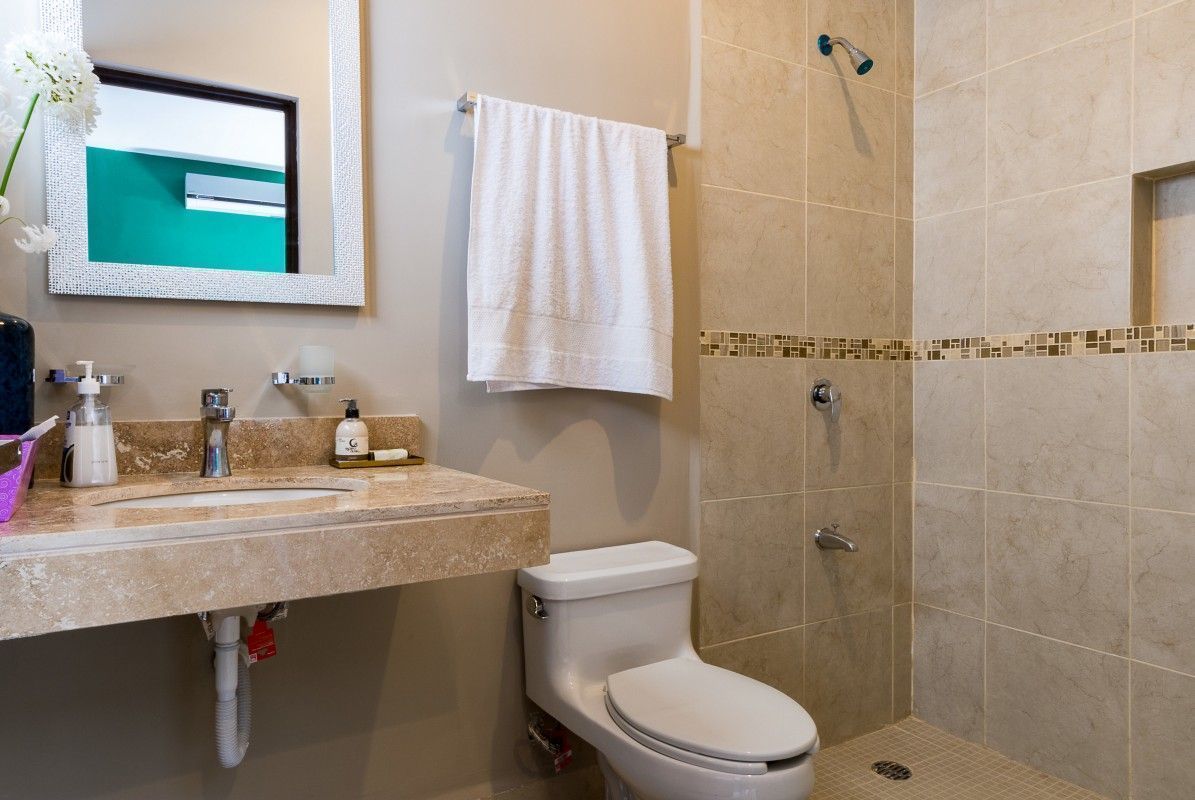 Área húmeda enlozada piso a techo en baños con mesetas crema maya
