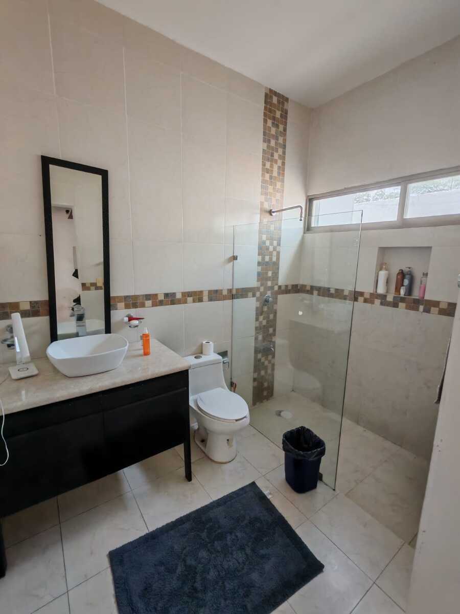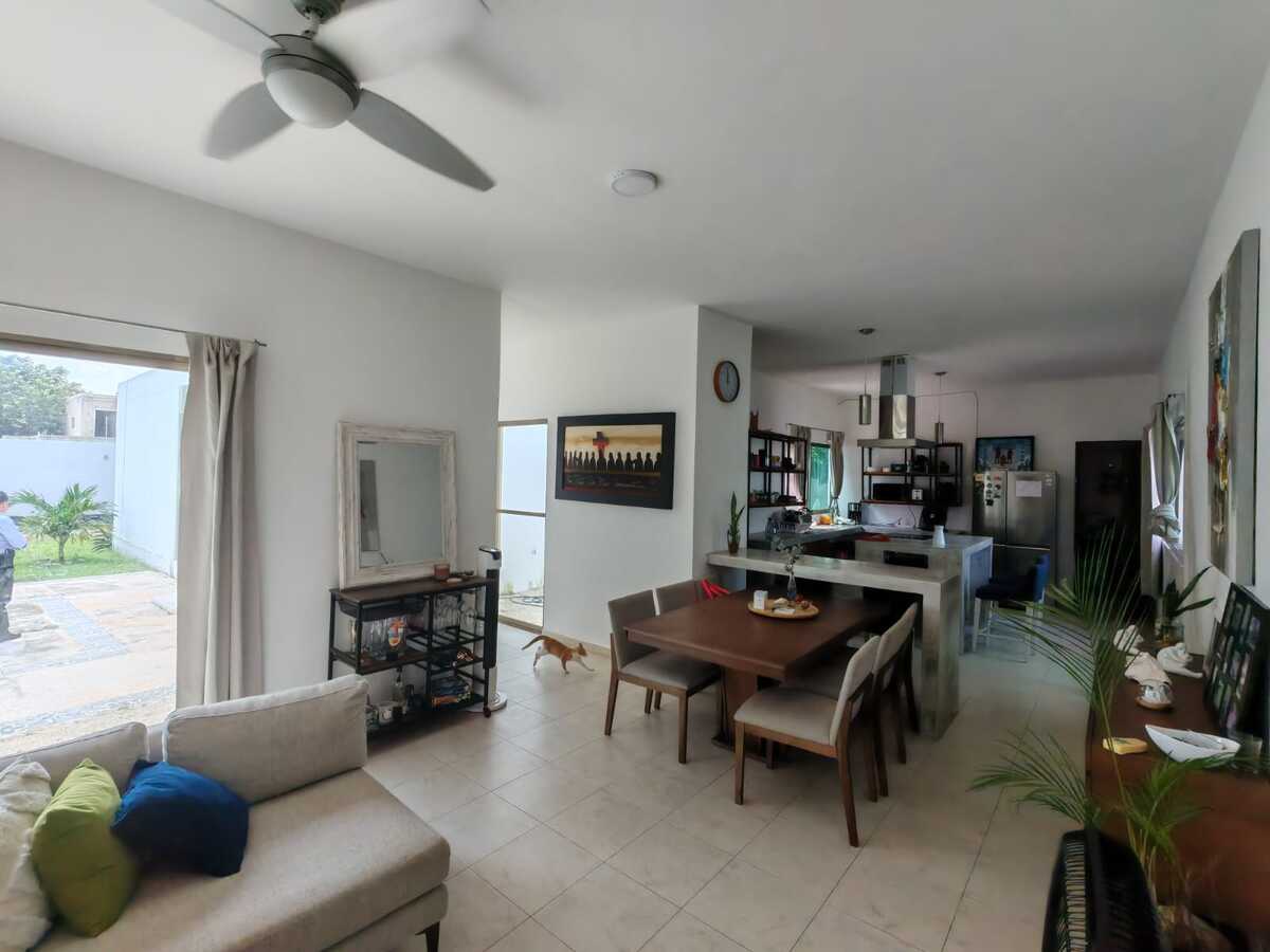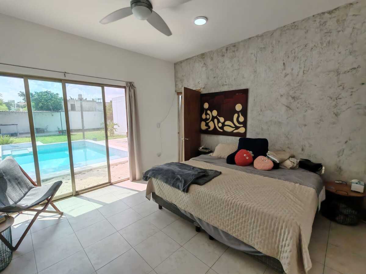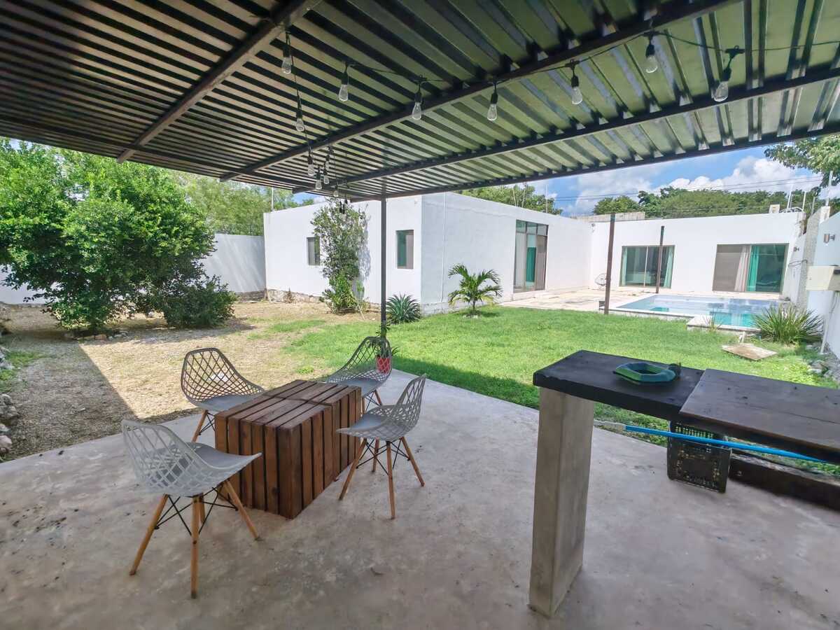 Casa de 800 m2 en Renta a la entrada del pueblo Chablekal. Amplia y cómoda, para una gran familia. De un solo piso con estacionamiento para 6 autos, portón manual, patio y alberca con pozo artesanal. Sala y comedor corridos, cocina con isla y barra desayunador, alacena. Área de lavado, medio baño de visitas. Dos recámaras con closet vestidor y baño propio. Otras dos recámaras compartiendo closet y baño. Equipamiento: