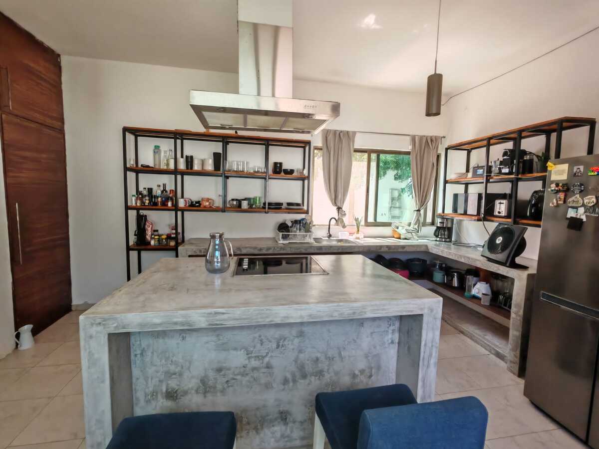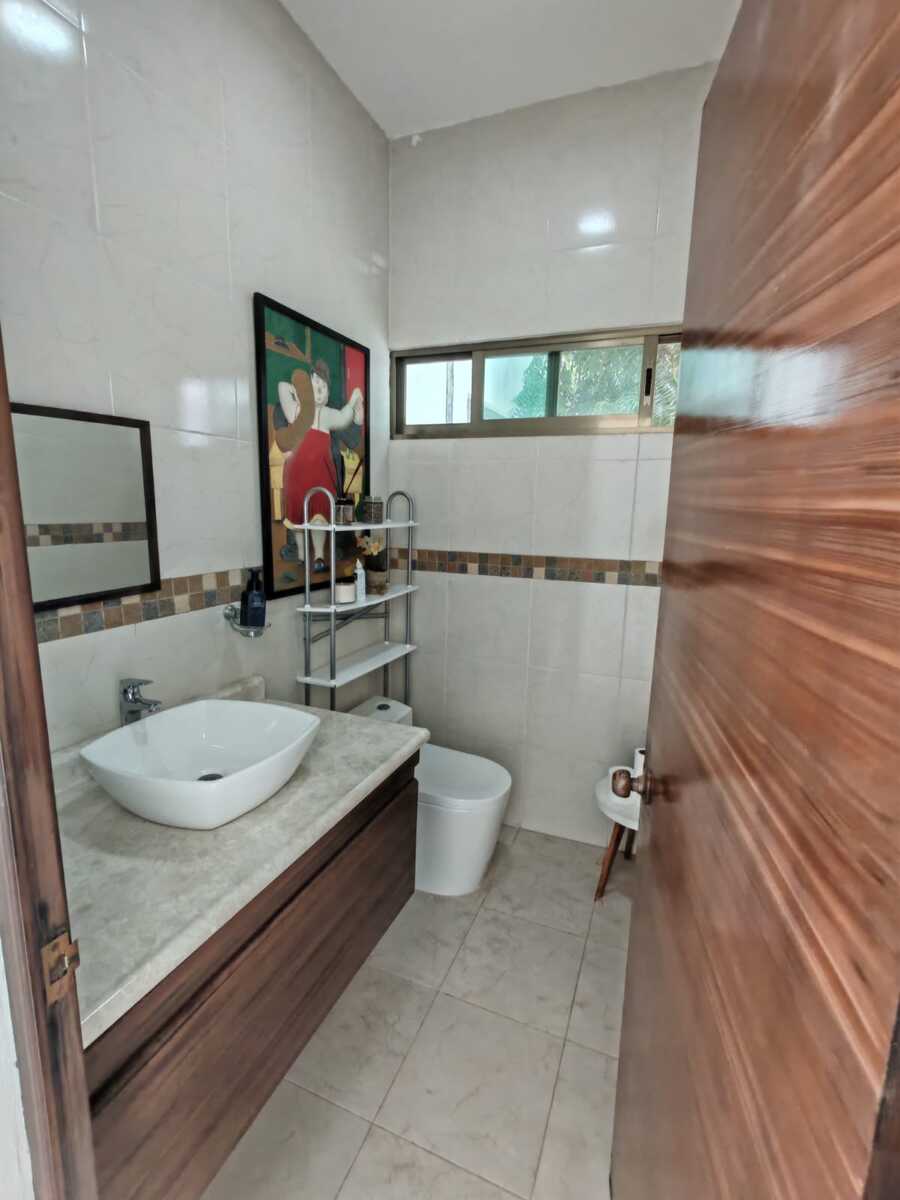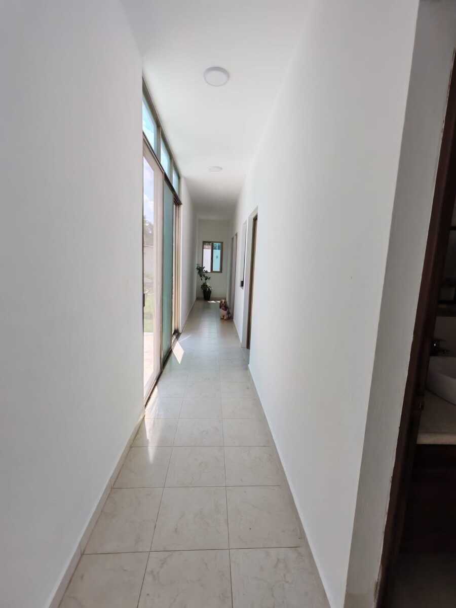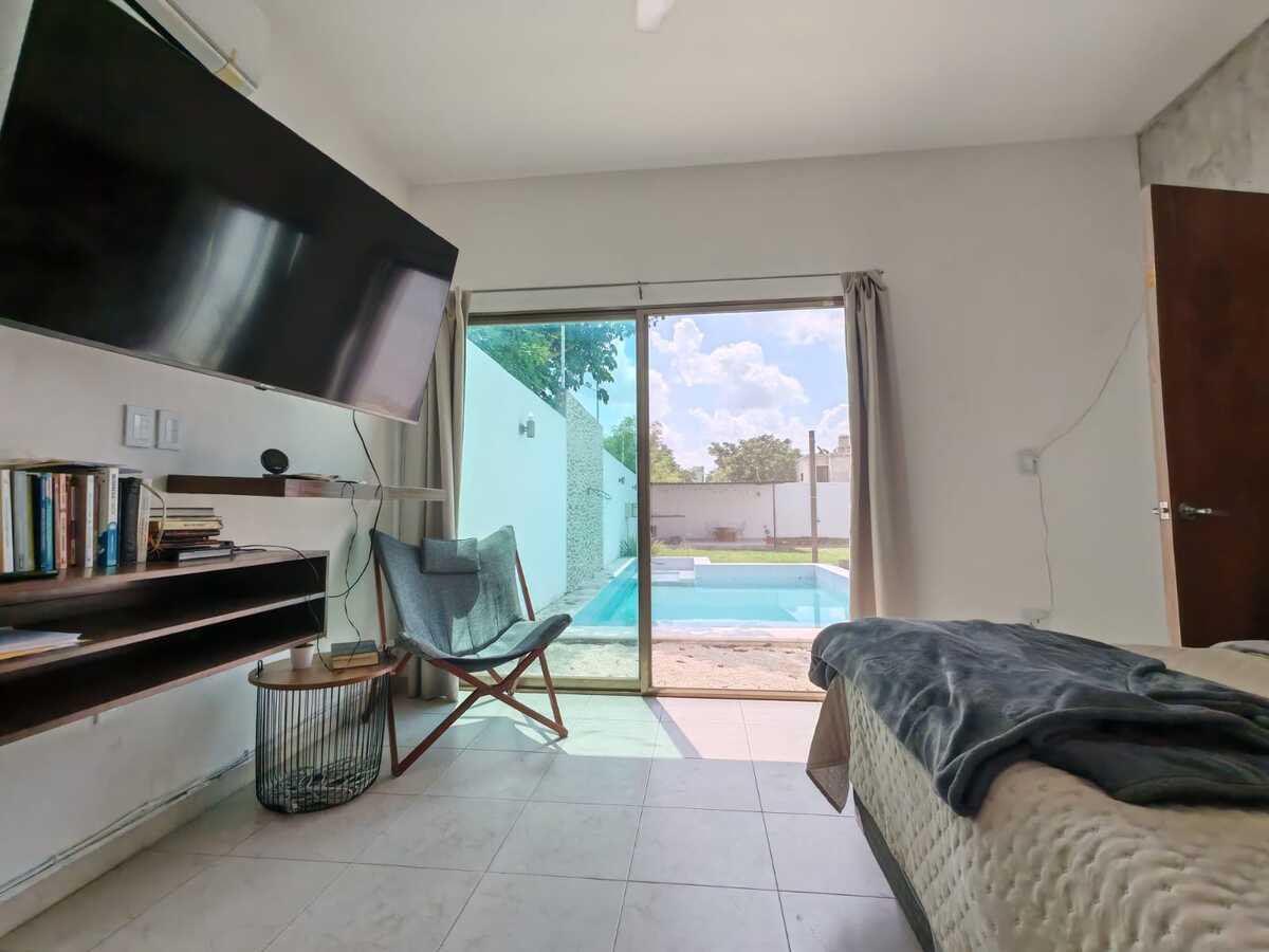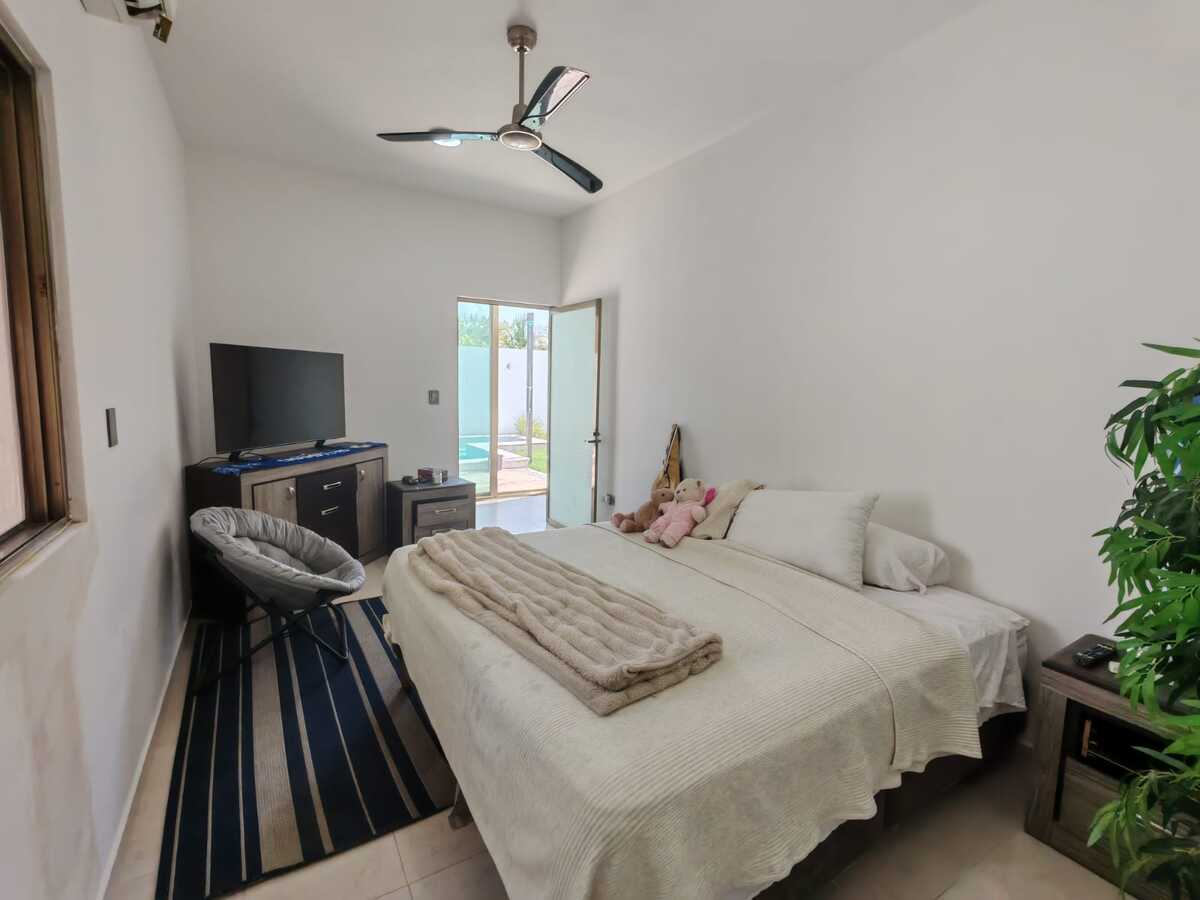 Casa de 800 m2 en Renta a la entrada del pueblo Chablekal. Amplia y cómoda, para una gran familia. De un solo piso con estacionamiento para 6 autos, portón manual, patio y alberca con pozo artesanal. Sala y comedor corridos, cocina con isla y barra desayunador, alacena. Área de lavado, medio baño de visitas. Dos recámaras con closet vestidor y baño propio. Otras dos recámaras compartiendo closet y baño. Equipamiento: