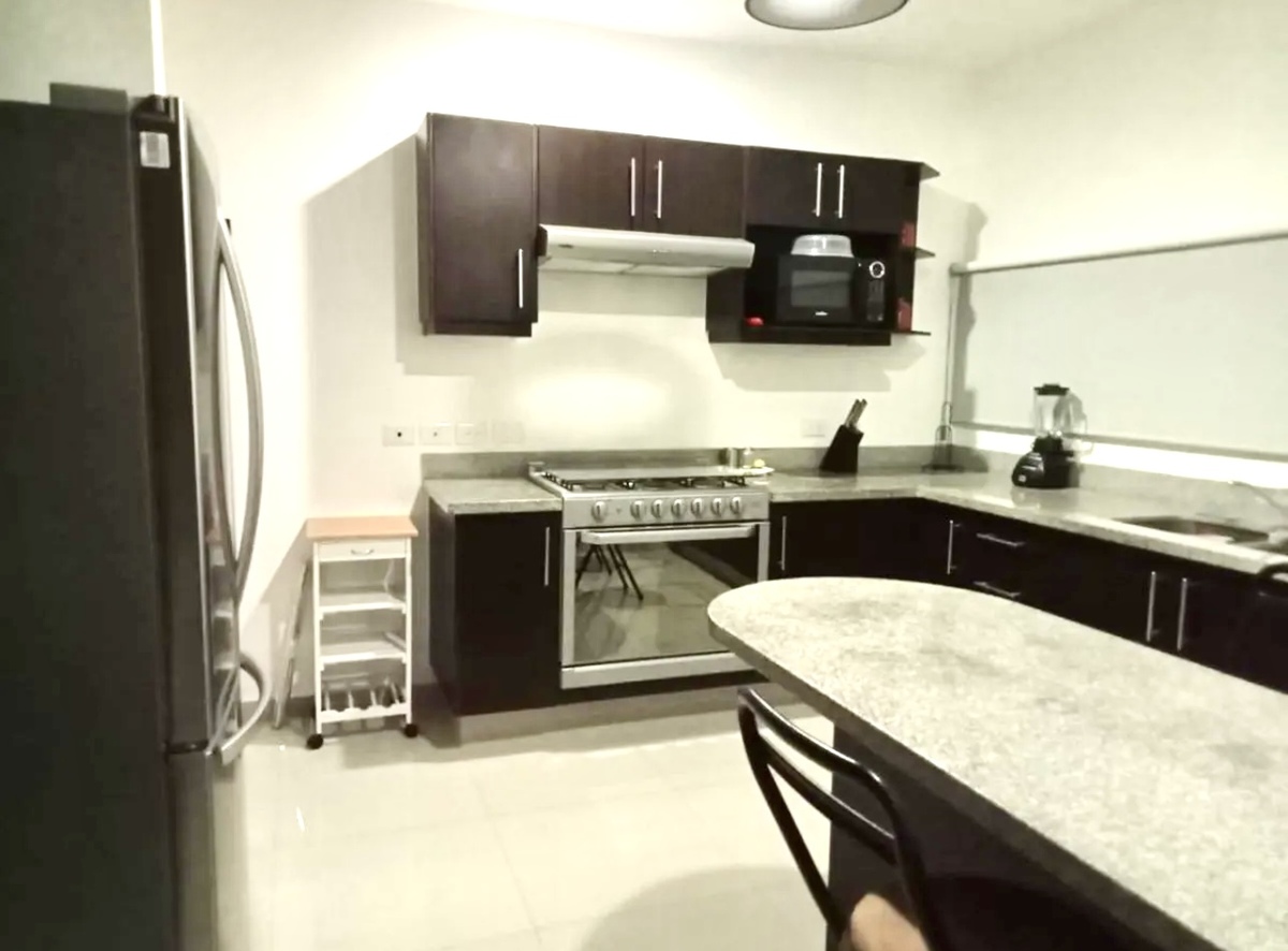 Cocina totalmente equipada con alacena, refrigerador, estufa con horno y AA