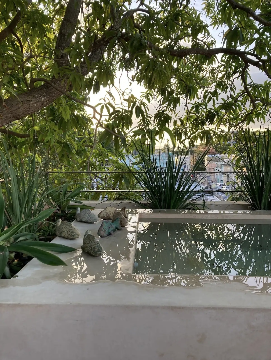 Amplia sala de estar/ Comedor/ Cocina equipada/ 1 recámara principal en planta baja con baño y jardín/ 1 recámara secundaria en la planta alta con baño/ Piscina/ Jardines superiores/ Nivel entrepiso/ Azotea con piscina estilo jacuzzi.