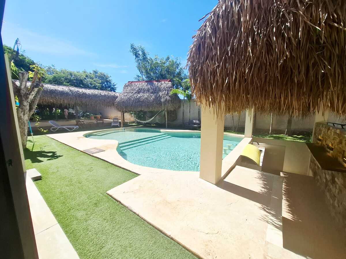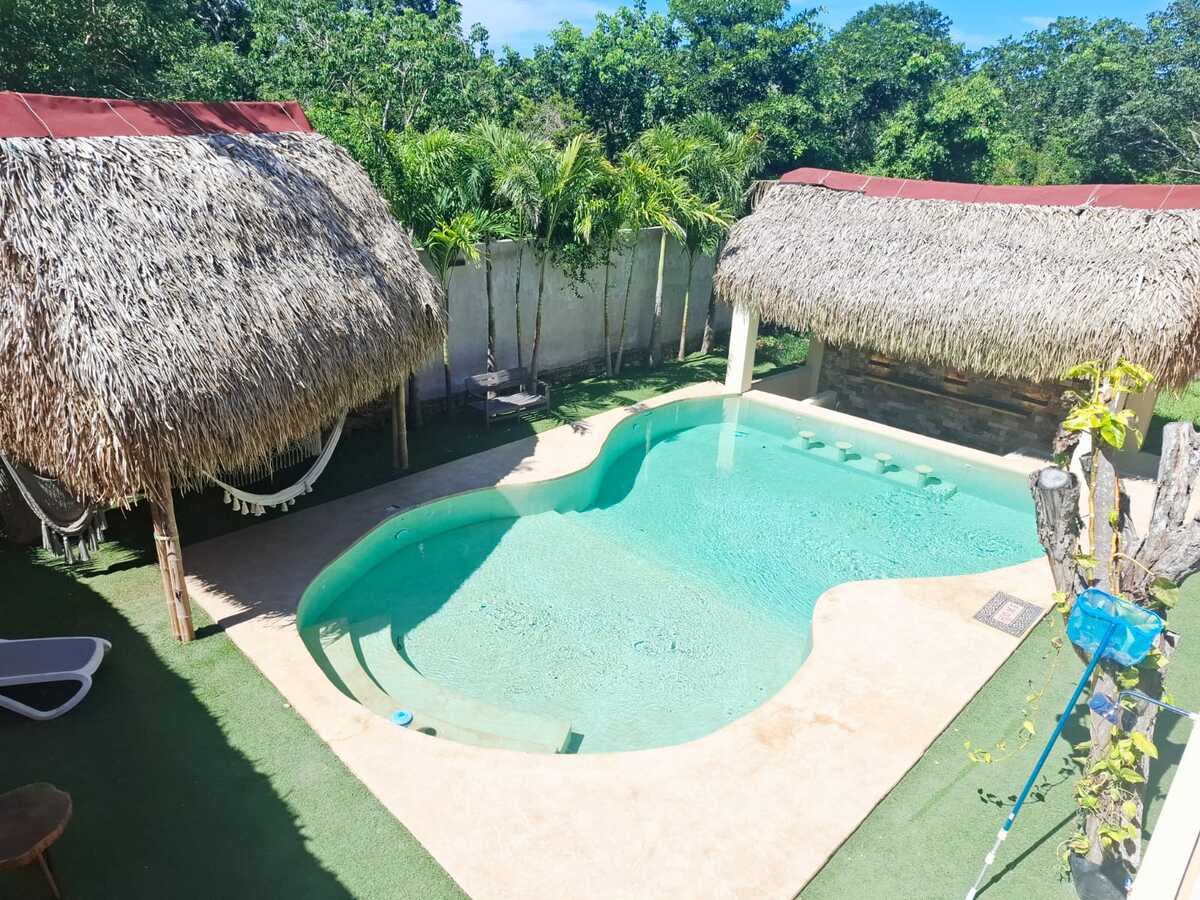 Alberca con área de bar, palapas, camastros y hamacas.