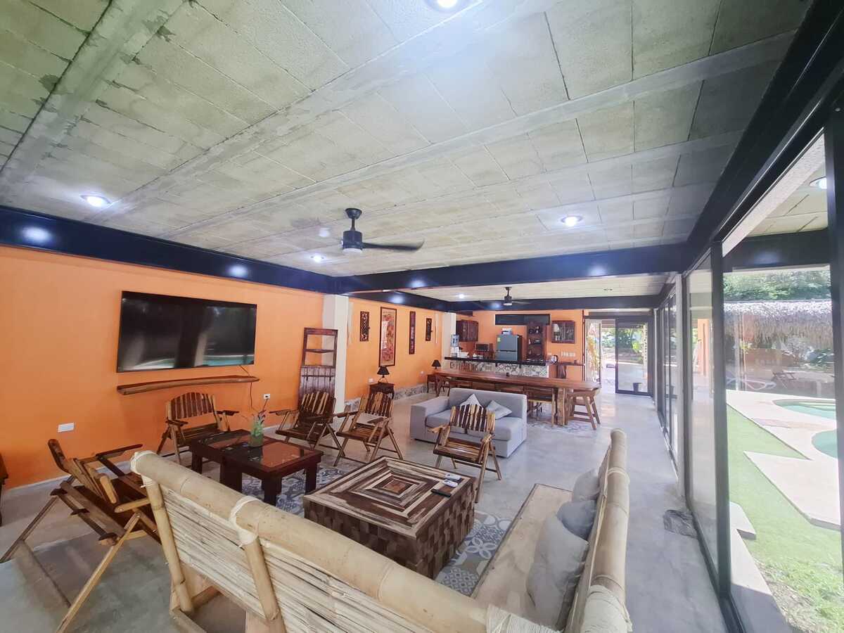 Sala amplia con aire acondicionado, ventilador y televisión