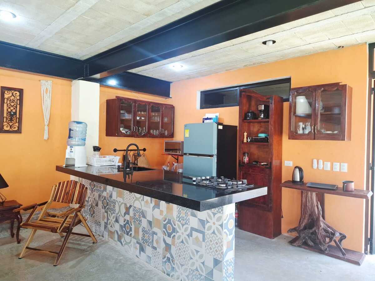 Cocina equipada con refrigerador, microondas, parrilla con 4 quemadores, barra de granito.