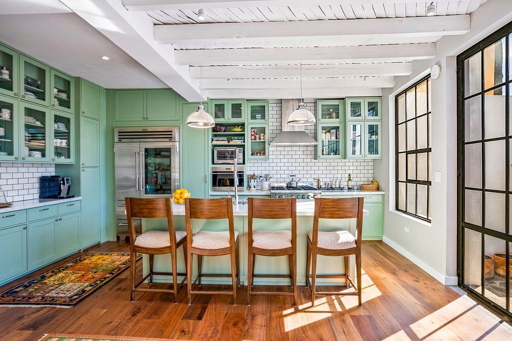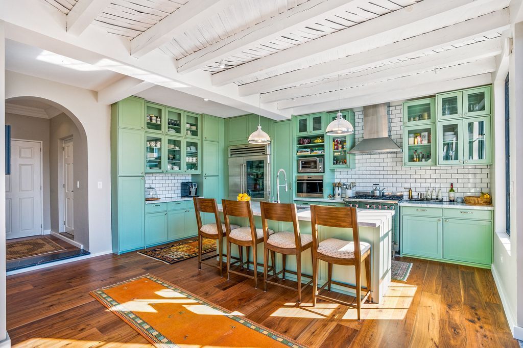 The formal dining room, anchored by a carved stone fireplace and warm wood floors, opens onto inviting living areas that connect seamlessly with the gardens. The gourmet kitchen is a highlight, featuring sage-toned custom cabinetry, high-end appliances, and a spacious island that flows onto a sunlit terrace, ideal for effortless indoor-outdoor living.