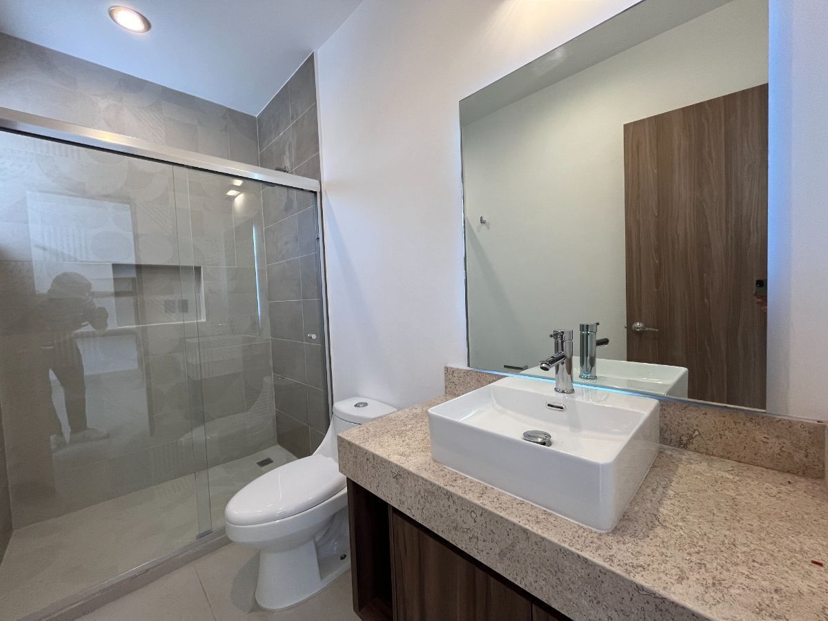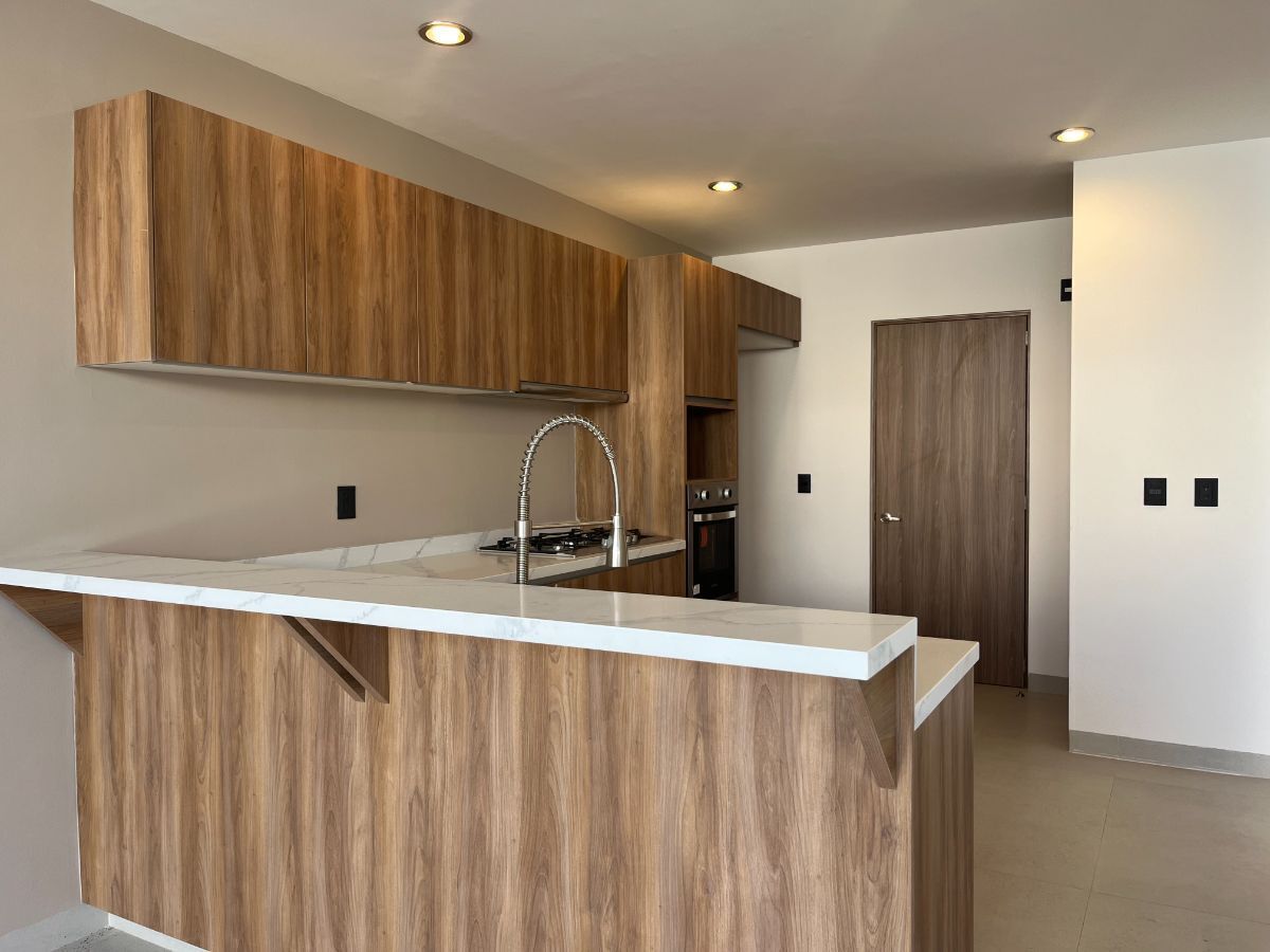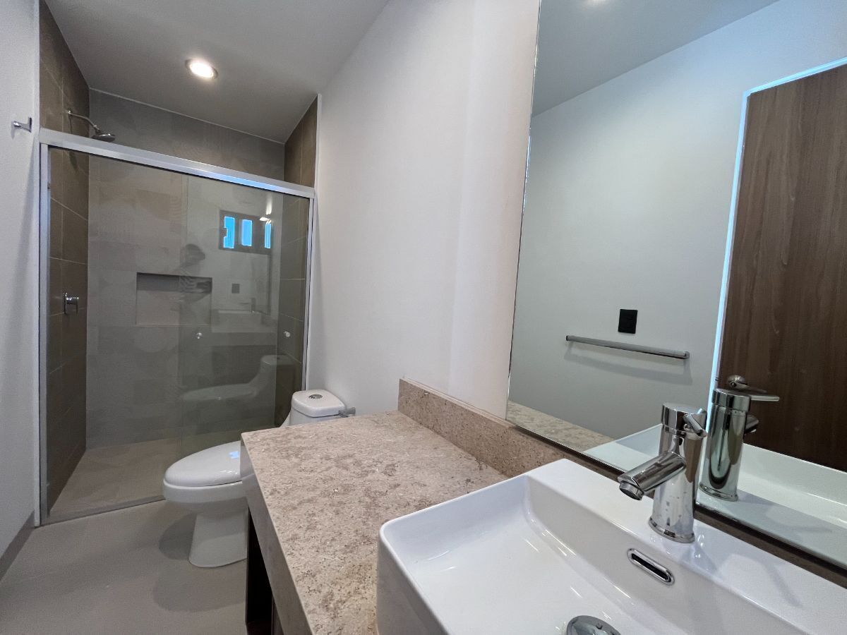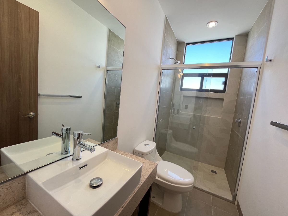 Estacionamiento para 2 autos, estudio, baño completo, sala, comedor, cocina equipada con barra, bodega, área de lavado y jardín.
