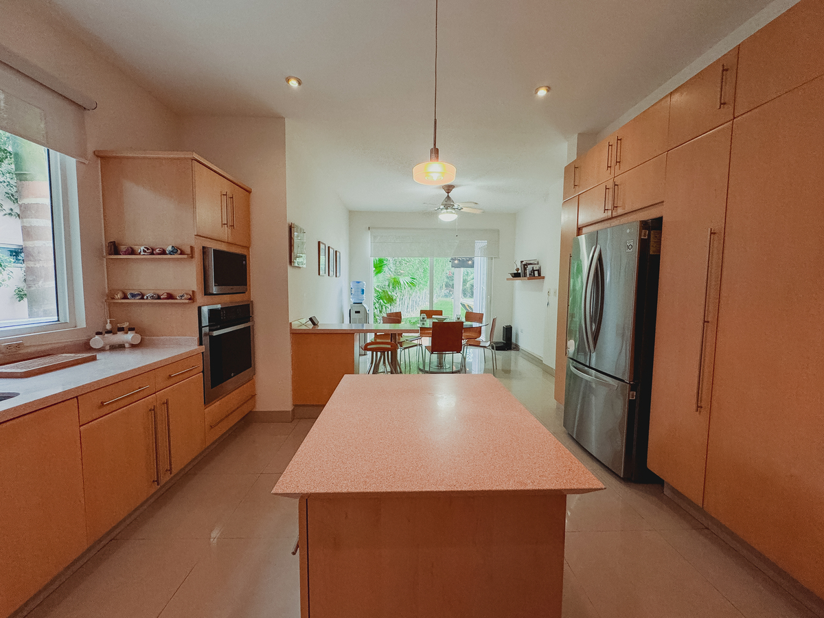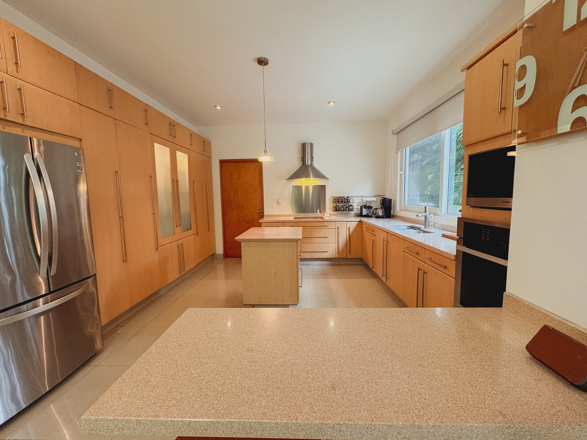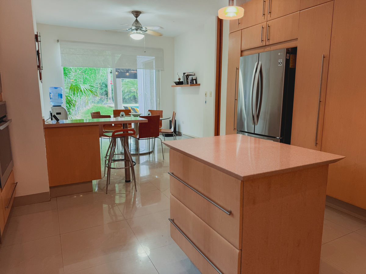 - Cocina con diseño europeo moderno y funcional, equipada con mesetas y barra desayunadora en Corian 👩🍳