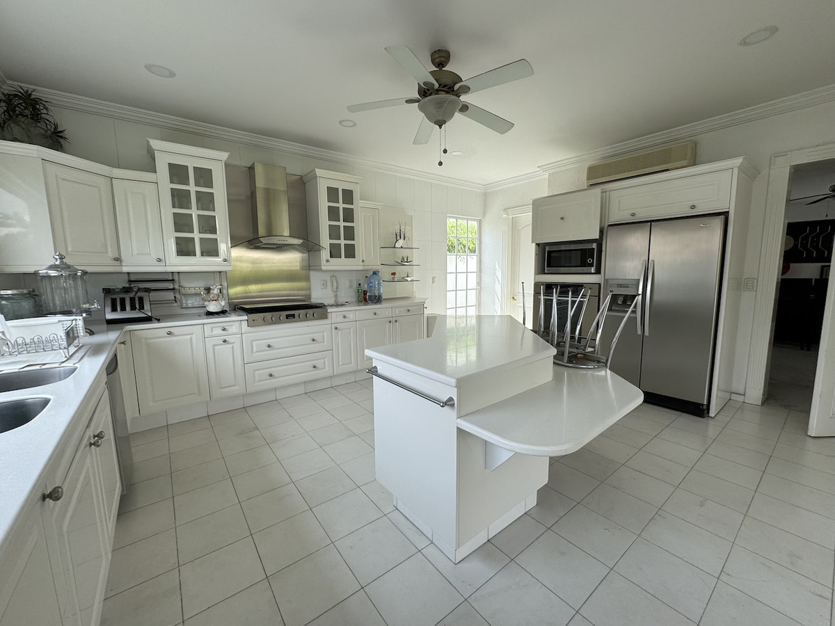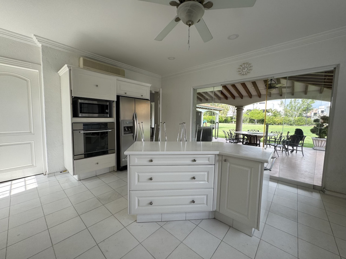 Cocina muy amplia, ventilada perfectamente gracias a sus ventanales, igualmente goza de vista igual del jardín y alberca. Grandes espacios para guardar. Área de lavado.