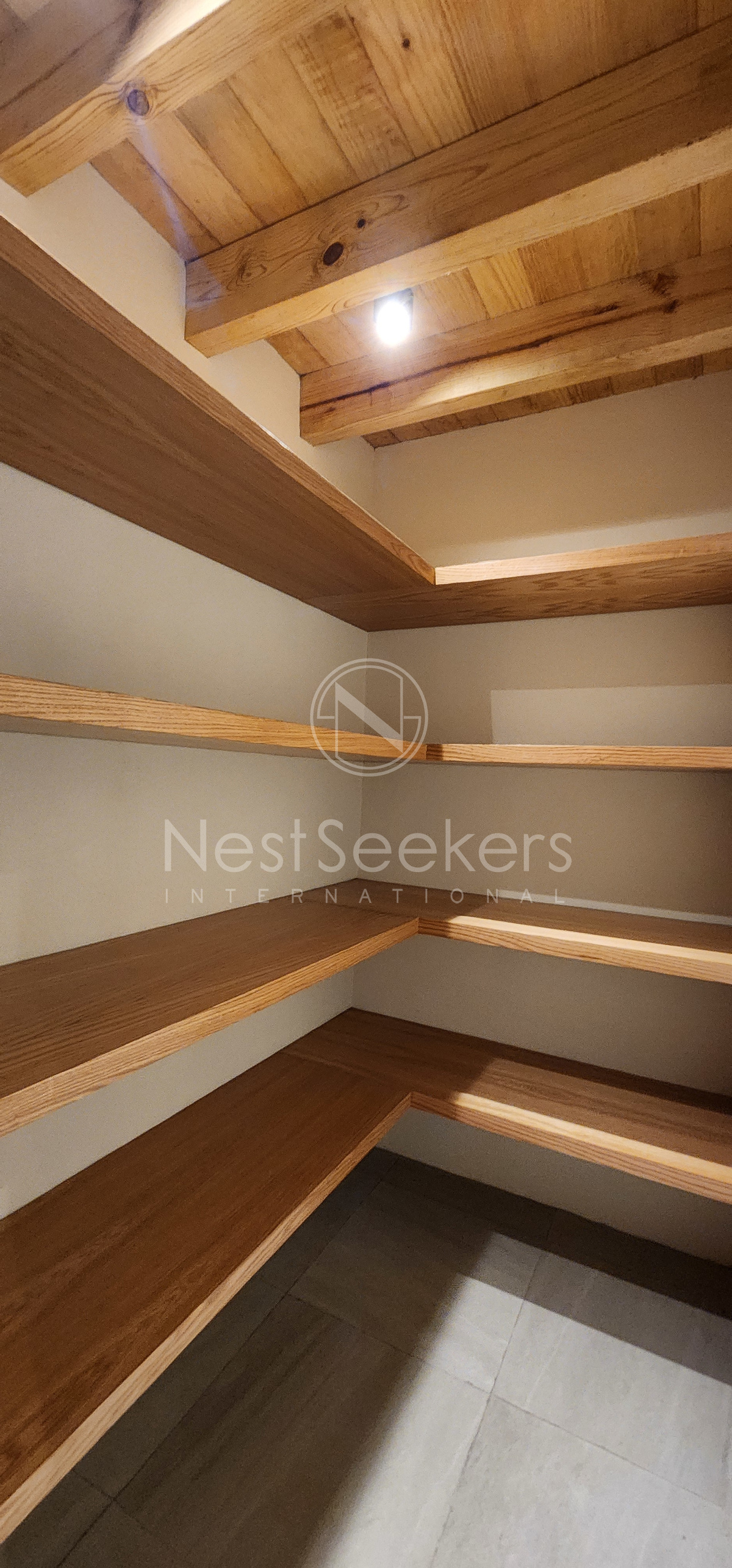 On the second level, you find a beautiful and spacious kitchen with a pantry, laundry room, service room with a bathroom. And at the front, living room, dining room, terrace, and garden with jacuzzi.