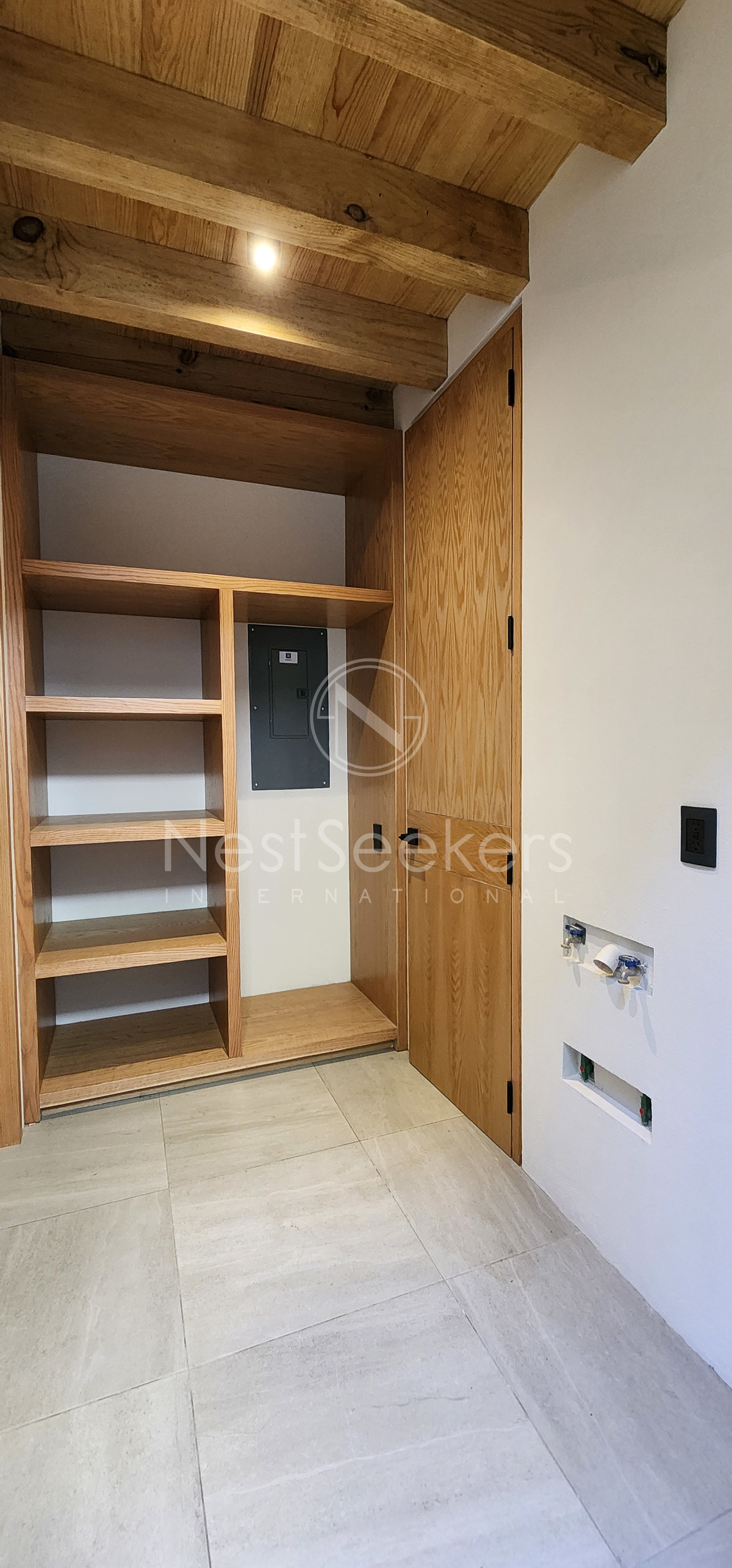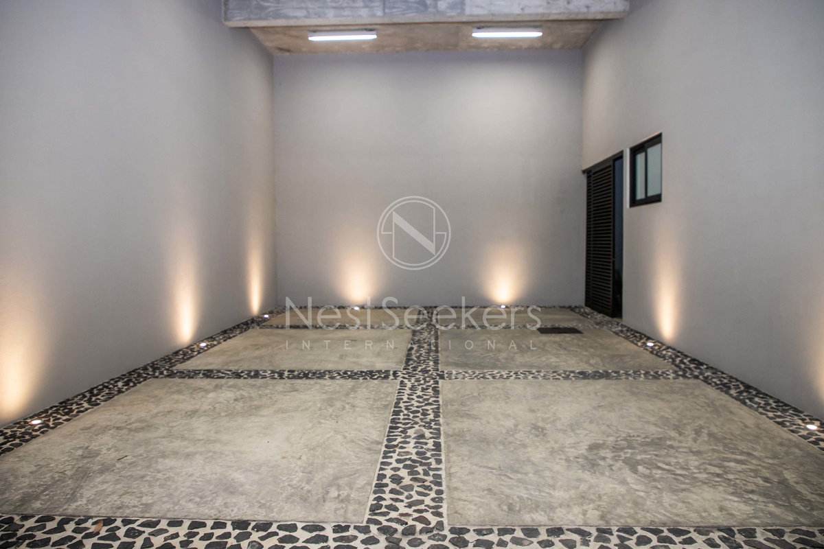 Se distribuye en tres niveles, en el primer nivel (nivel de la calle), encuentras un amplio estacionamiento techado para 4 o 5 autos dependiendo de su tamaño, una amplia bodega para reisers, motos y bicicletas, etc. Un recibidor y cuarto de juegos con baño completo.