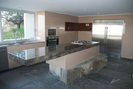 Living and dining room separated with wooden floor, family room, equipped kitchen "Quetzal", breakfast nook, pantry, dishwasher, and a study with built-in furniture.