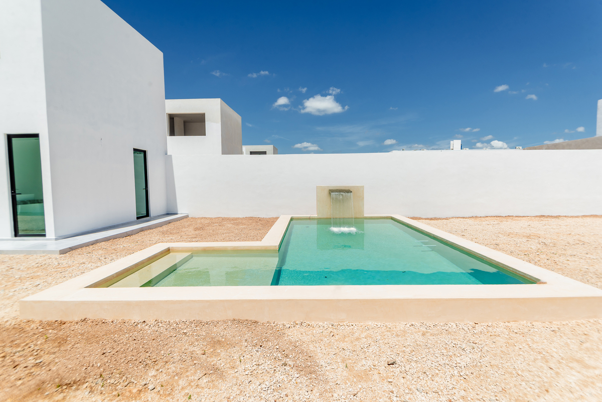 Alberca con acabado chukum, diseño cuadrado con palmeras