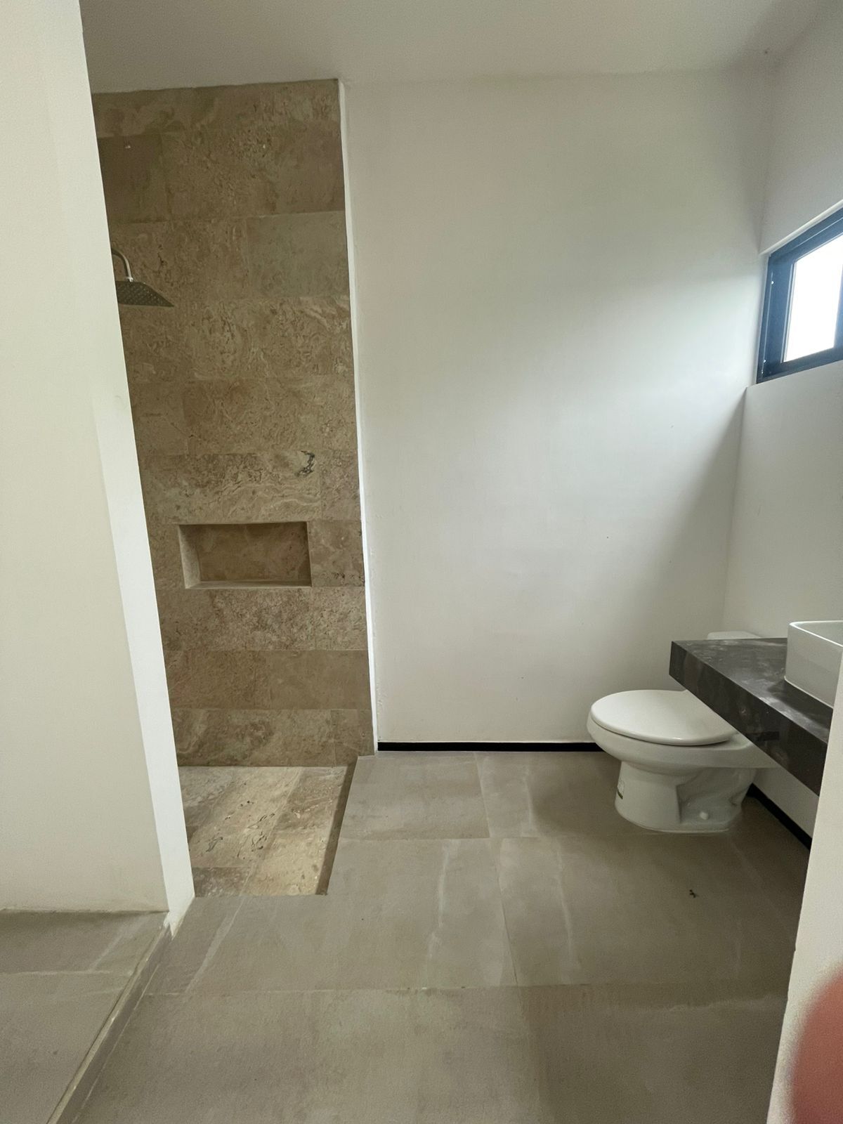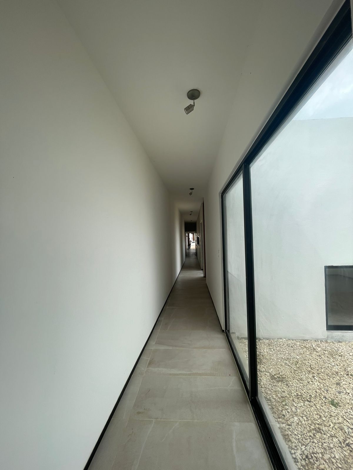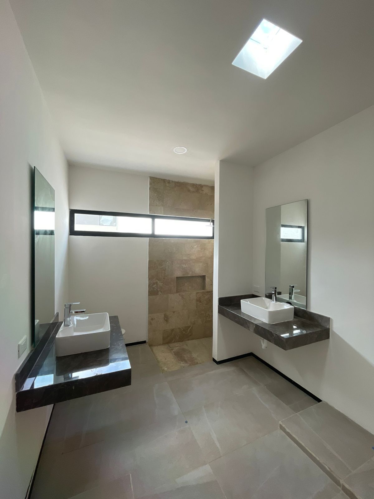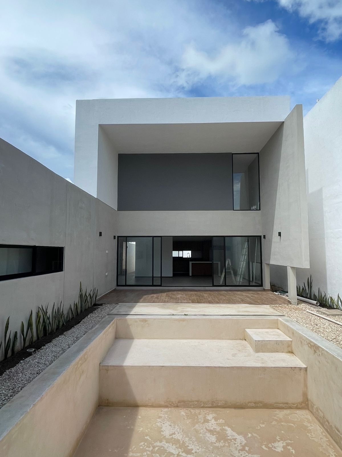 Garage techado para dos coches, cocina, sala comedor a doble altura, medio baño, área de servicio, terraza techada, recámara principal con baño y walk in closet, dos recamaras con closet vestidor y baño.