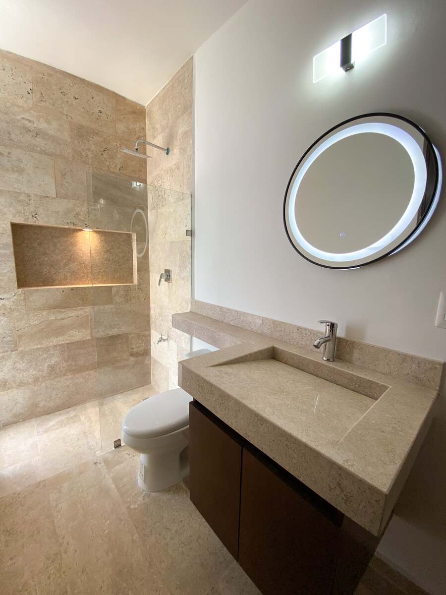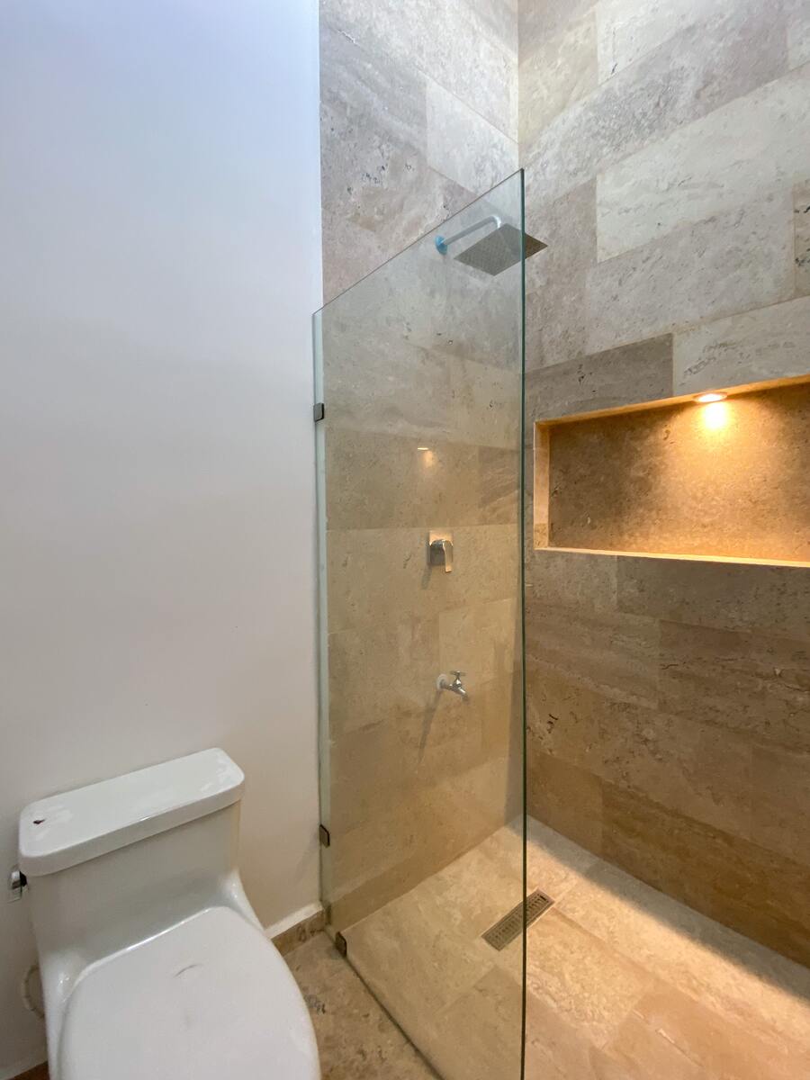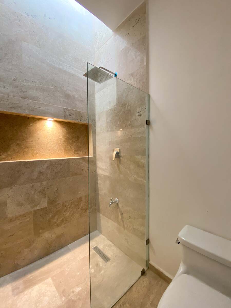 Acabado de mármol travertino en pisos, zoclos y regadera