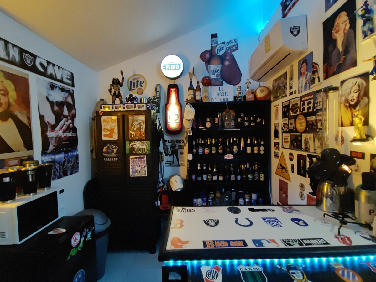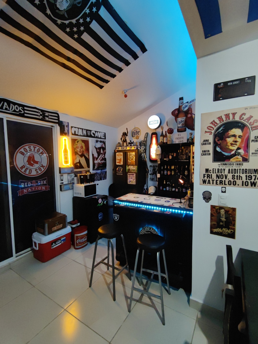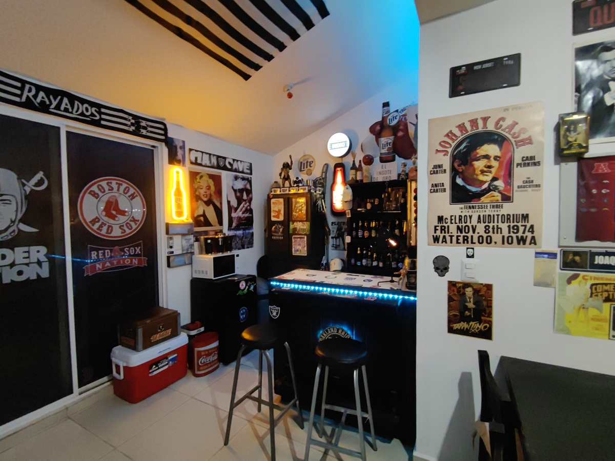 Puerta principal de seguridad, protectores, canceles de baño, ventiladores de techo y bar.