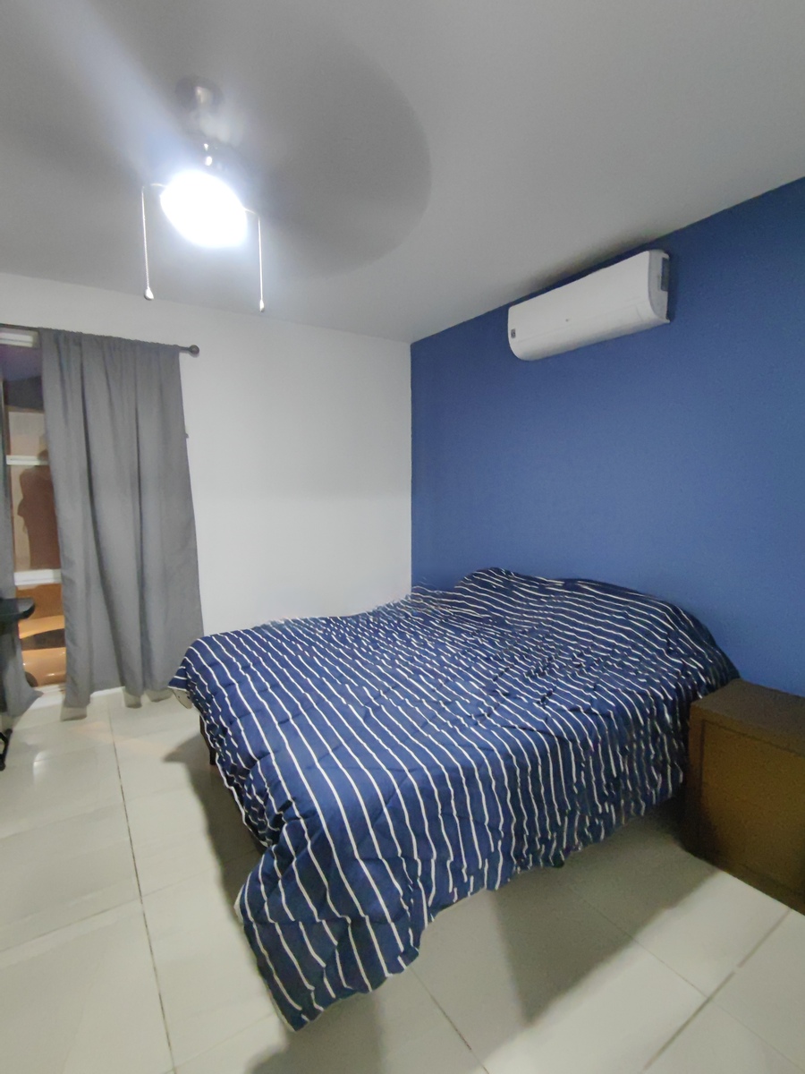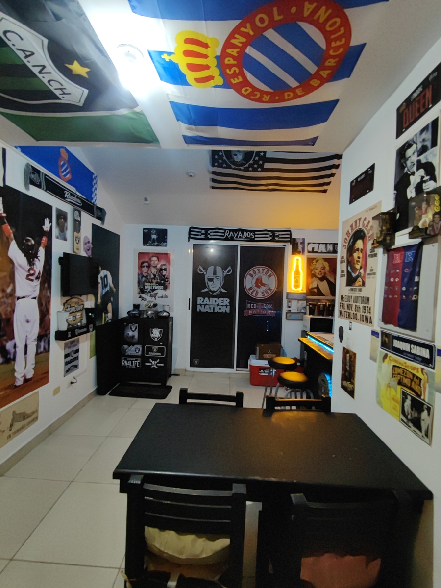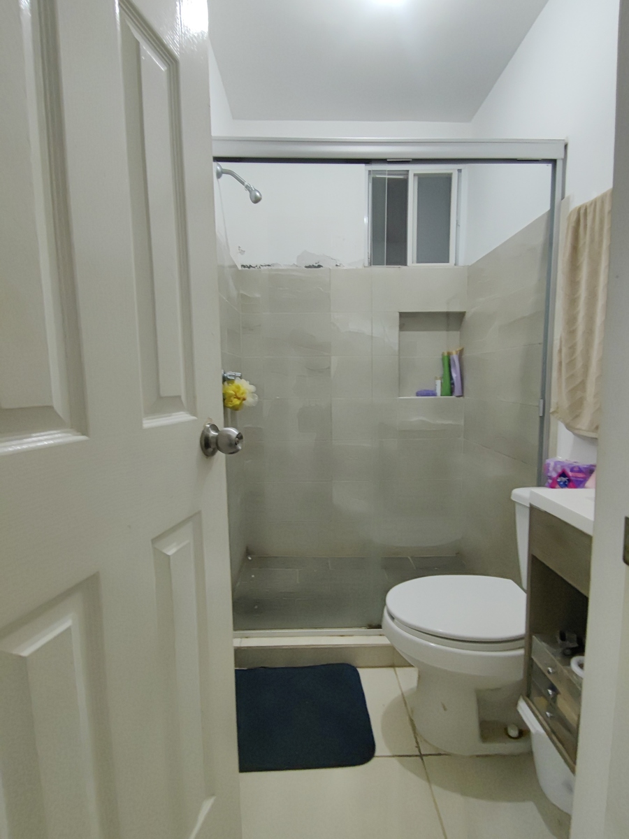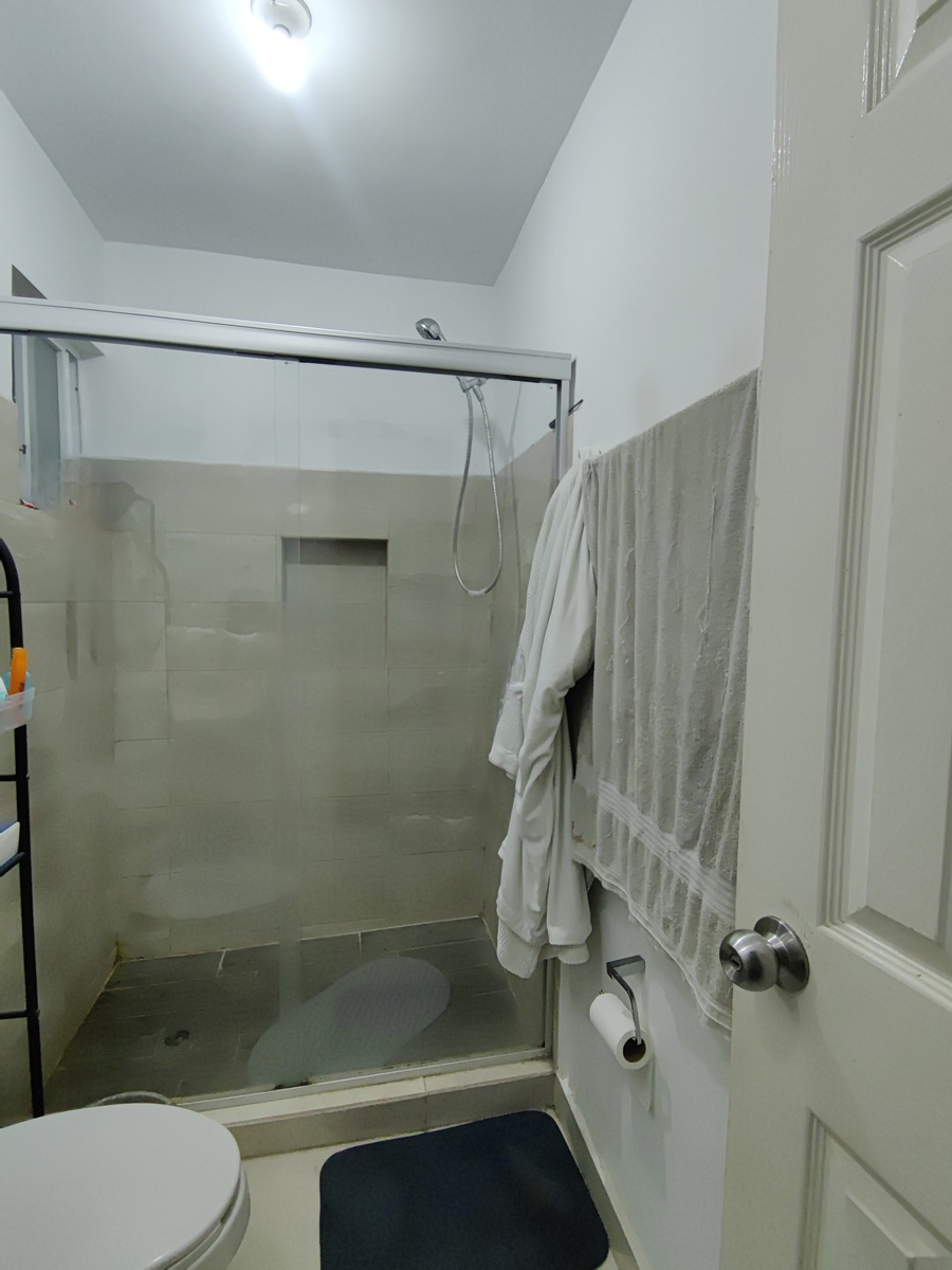 Puerta principal de seguridad, protectores, canceles de baño, ventiladores de techo y bar.