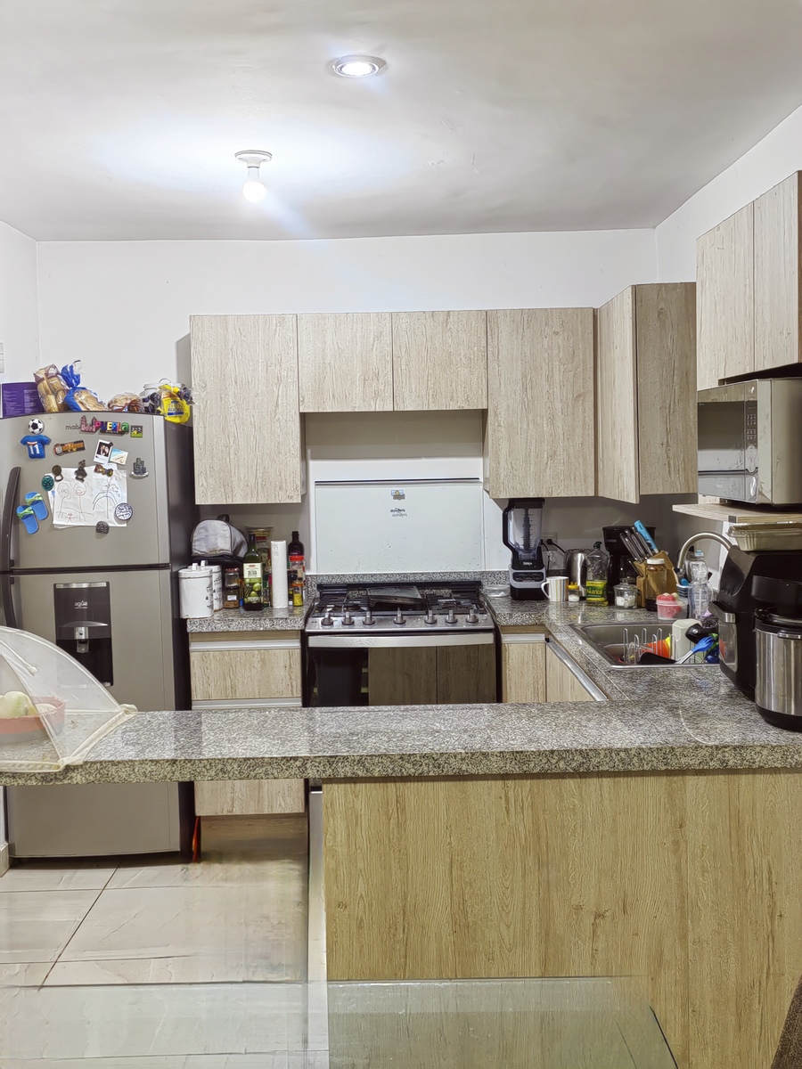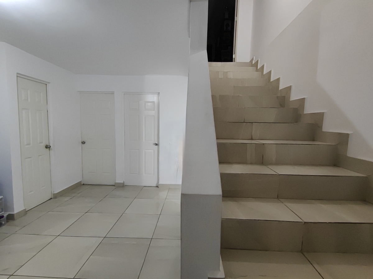 PLANTA BAJA: cochera techada para 2 autos, sala, comedor, cocina equipada, lavandería, medio baño, pasillo lateral y patio.