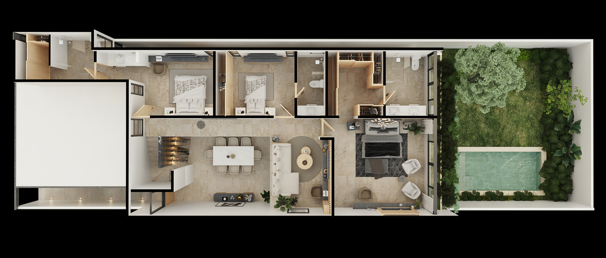- Casa club con: kids club, gimnasio, salón de yoga y funcional, sauna, coworking, lobby bar, alberca con canal de nado, locker room, deck de asoleaderos, salón de fiestas
