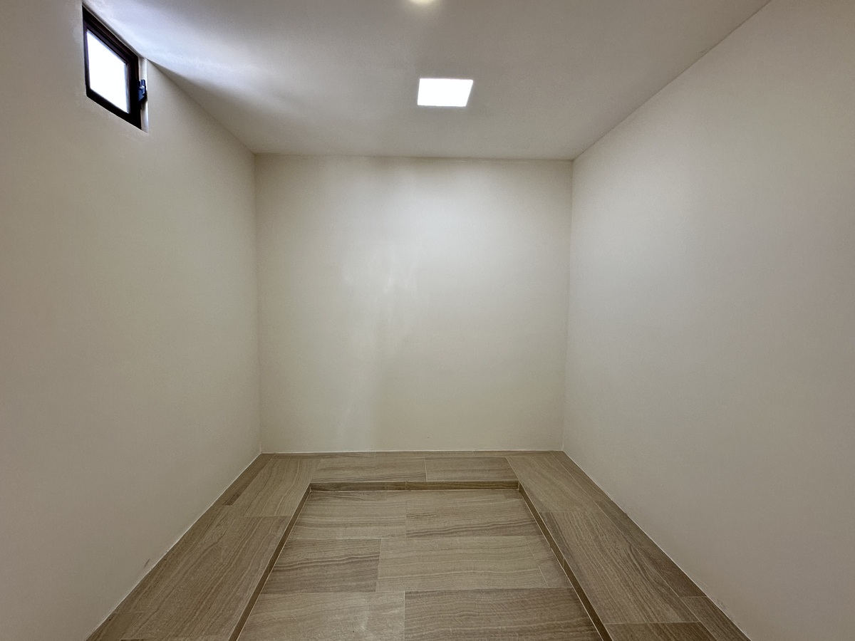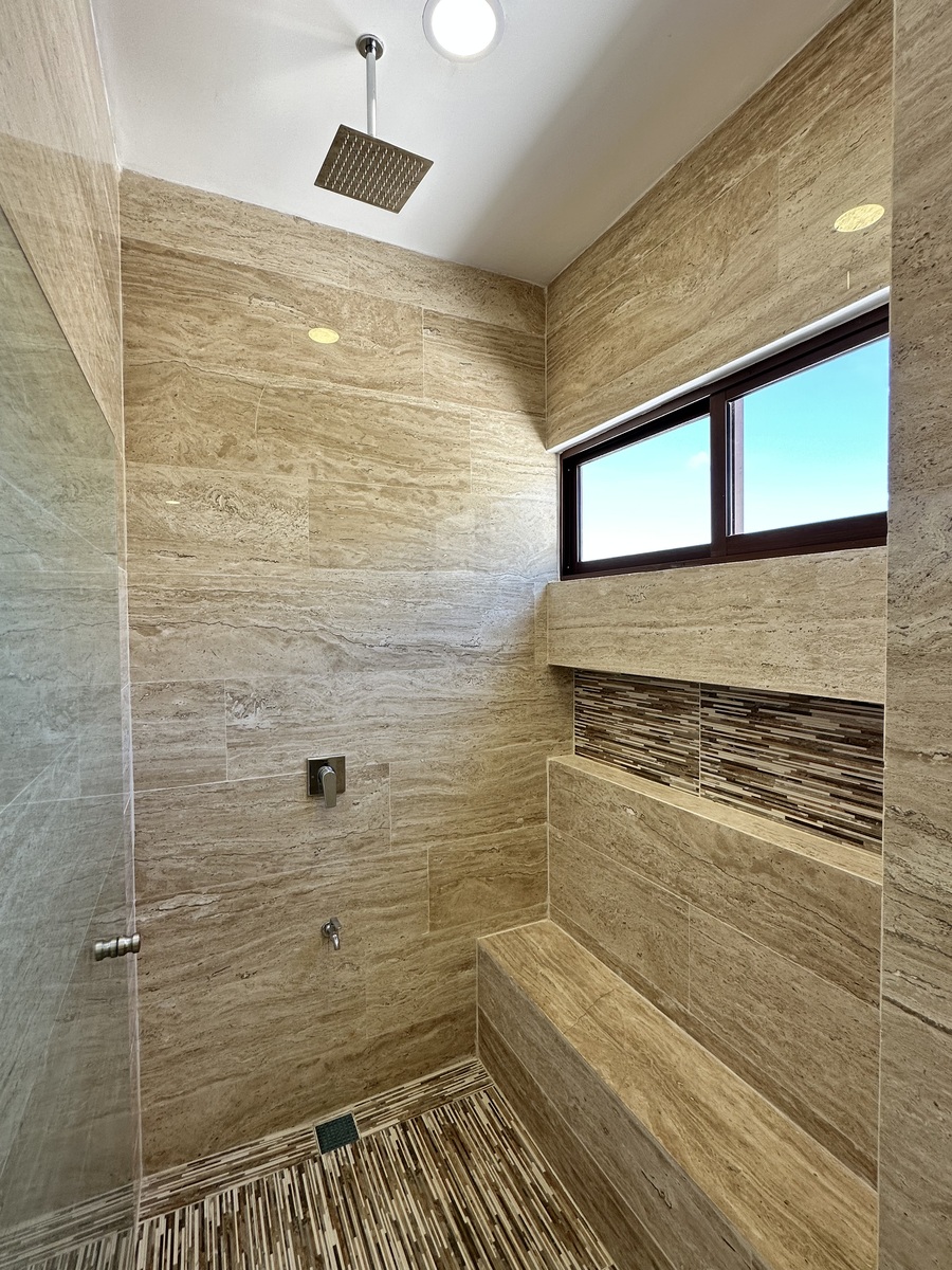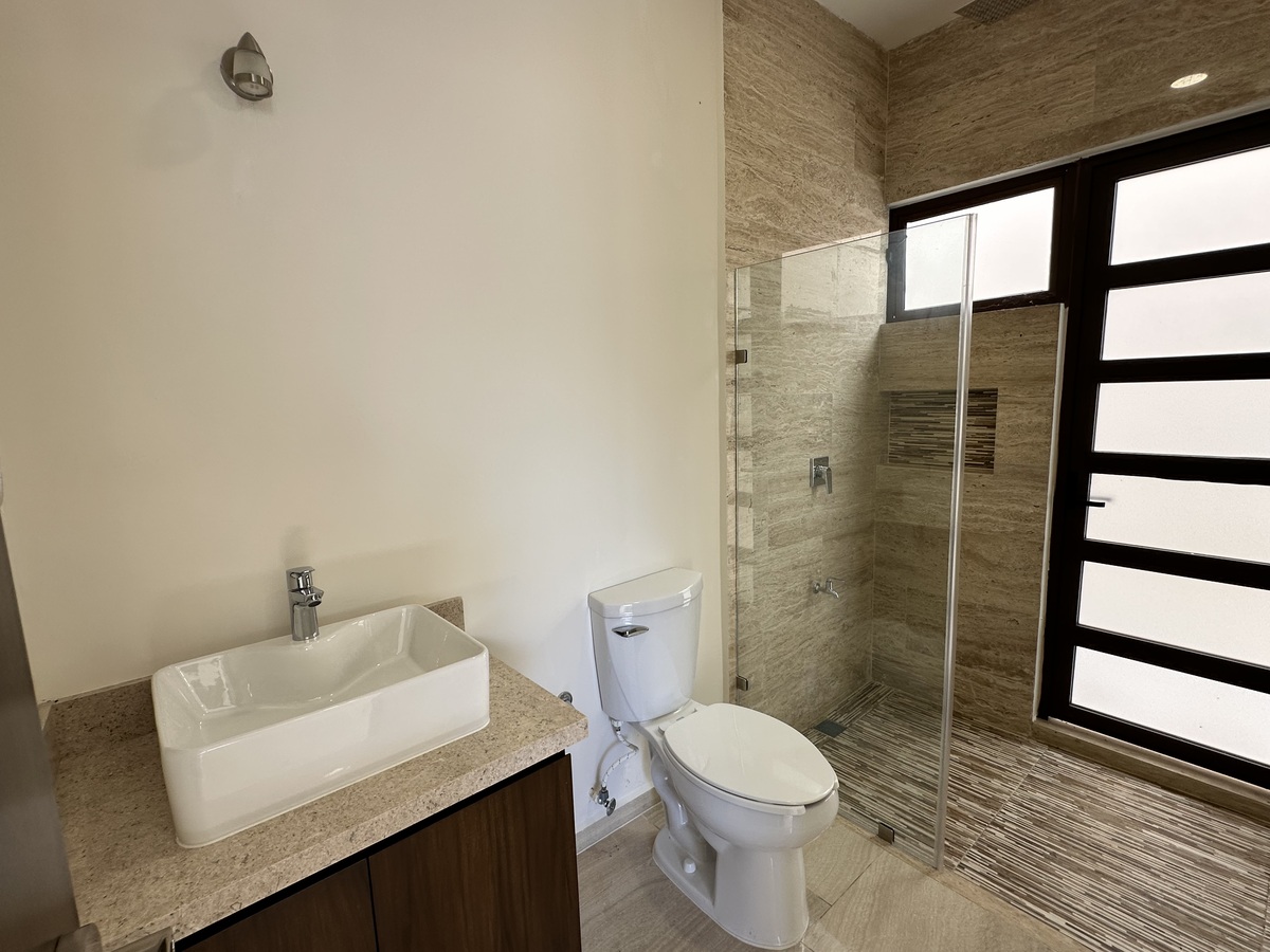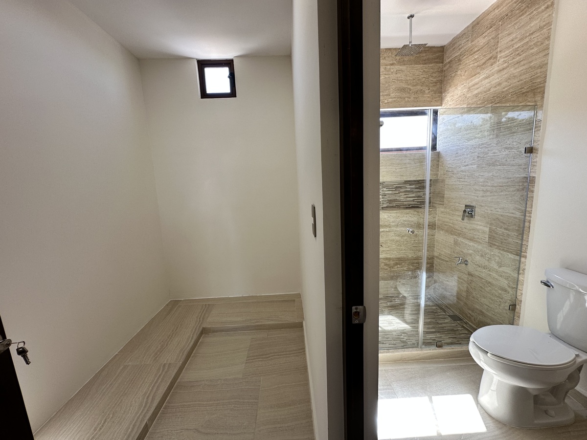 Habitación principal con área de clóset vestidor, lavabo doble, regadera, área de wc.