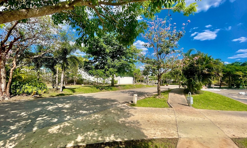 Senderos y avenidas centrales con abundantes áreas verdes.
