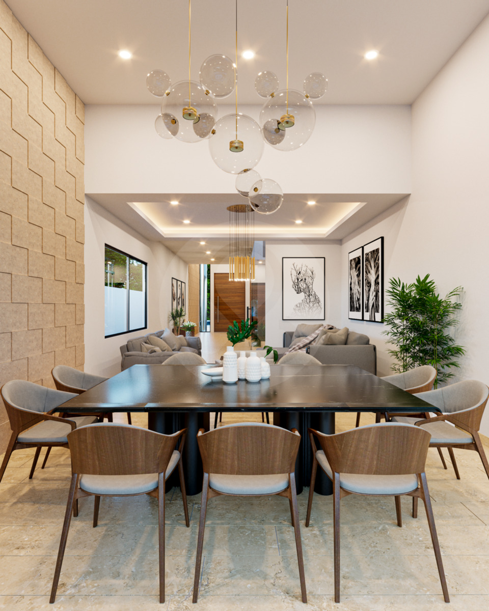 • Sala comedor corrida con agradable vista a la alberca y al jardín posterior e interior.