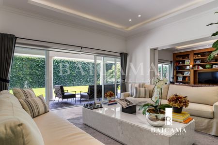 Ground floor: impressive triple-height entrance hall, spacious dining room with garden views, and a living room that connects to a terrace overlooking the ravine. Music room/study with acoustic insulation and a kitchen with Italian cabinetry and pantries. Landscaped gardens flank the floor, highlighting the terrace framed by jacaranda trees.