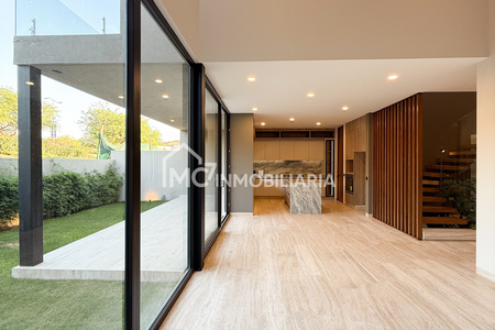Casa con excelente jardín, cocina equipada con materiales europeos, integrada a sala comedor y amplia terraza completamente equipada.