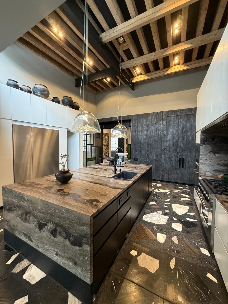 1er. Nivel: sala, comedor, cuarto de piano o estudio, baño de visitas, amplia cocina de lujo, cuarto de cafetería con despensa, terraza con comedor y espacio para asador, recámara principal con vestidor y baño completo y recámara con grande librero y baño completo.