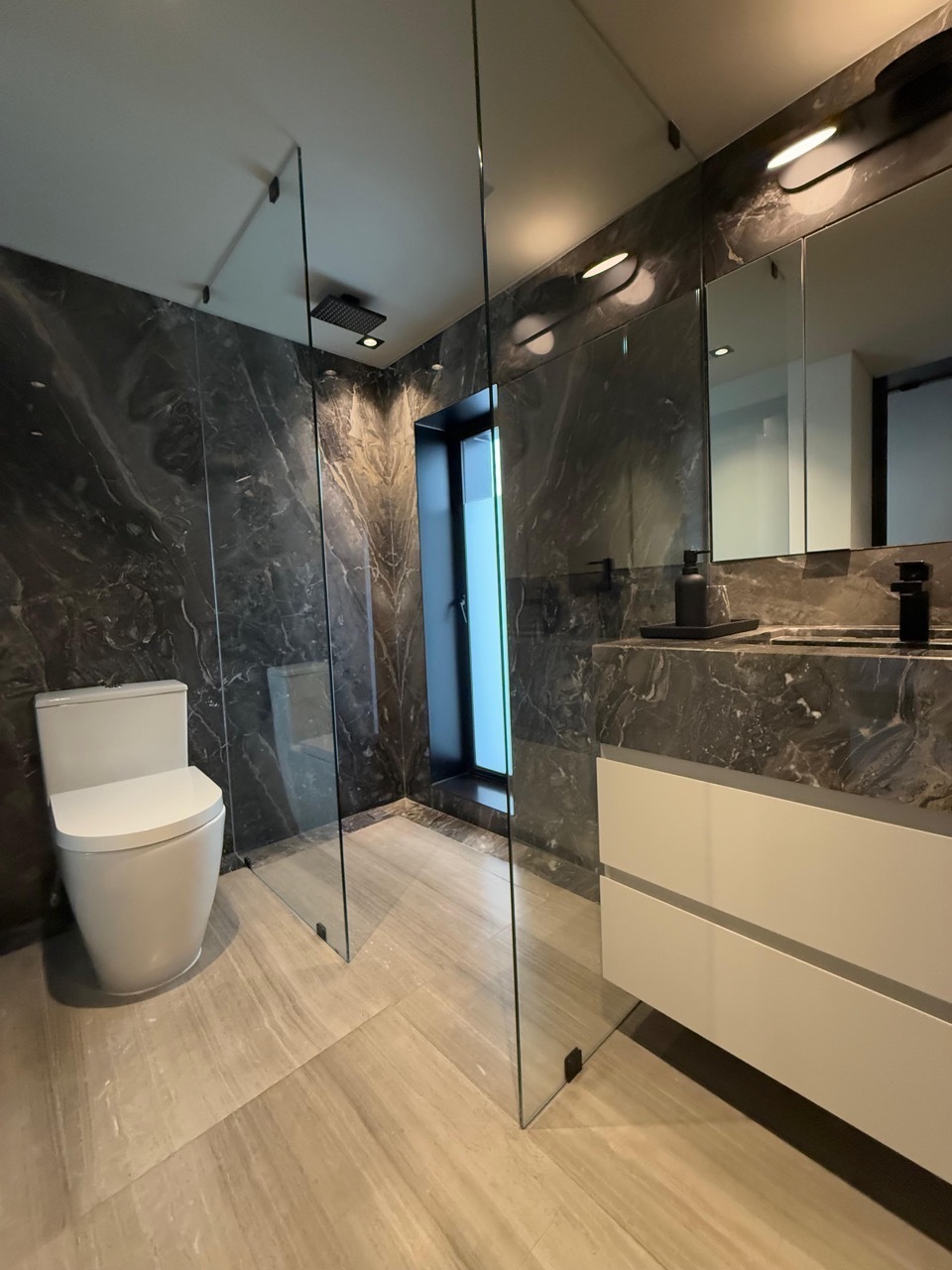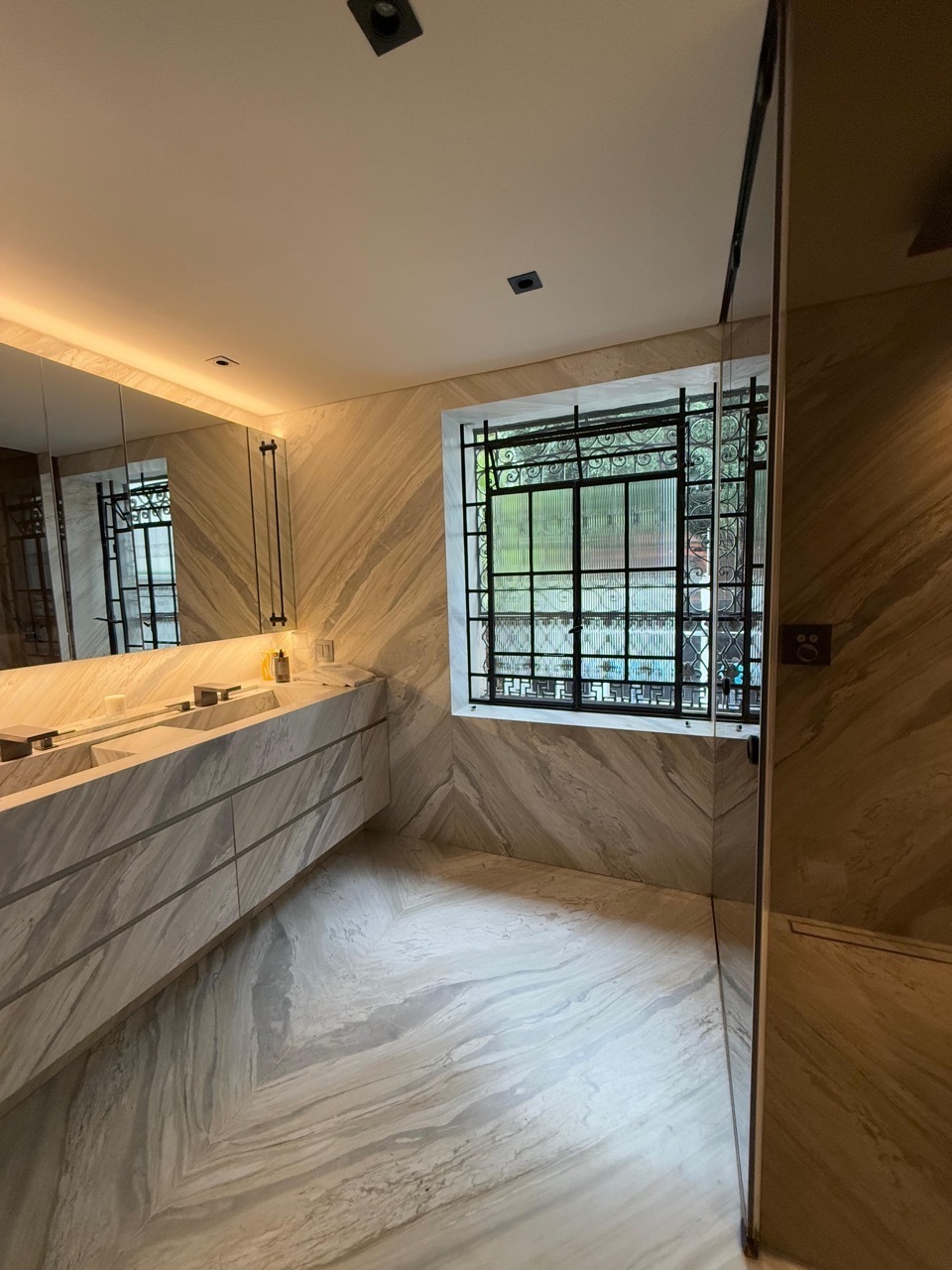 Ground Floor: Parking for 4 cars; 1 covered car and 3 uncovered cars, large service room with kitchen and full bathroom, laundry room, covered patio with natural light, 2 bedrooms with bathroom and space for closet, study or game room with bathroom, large main patio with planters.