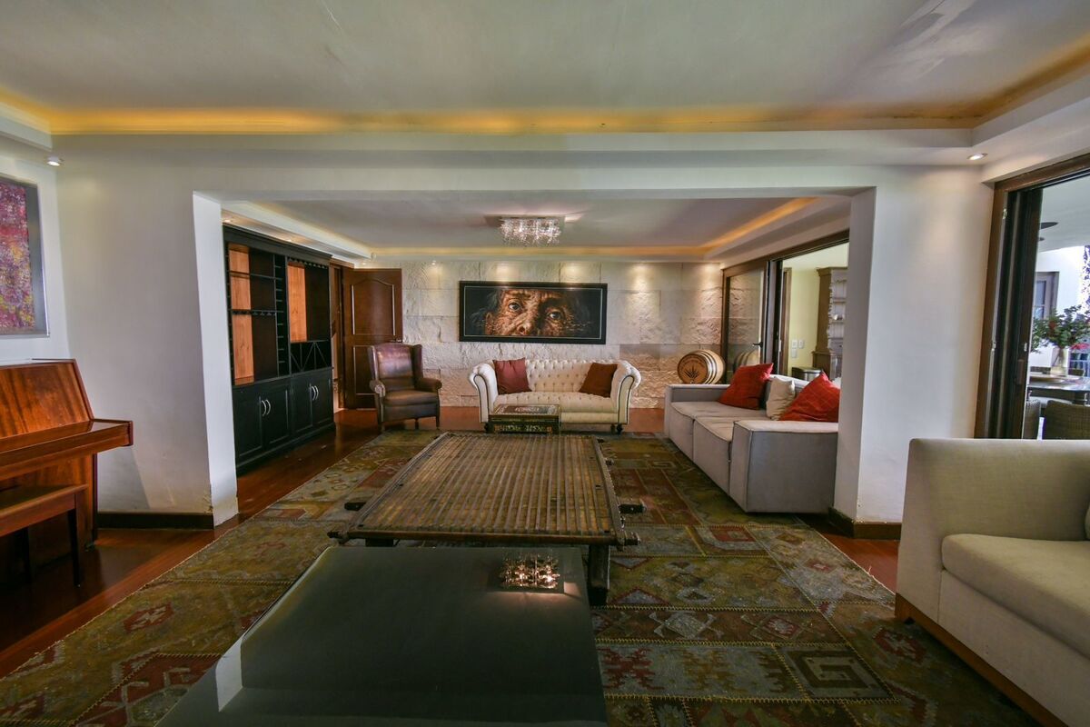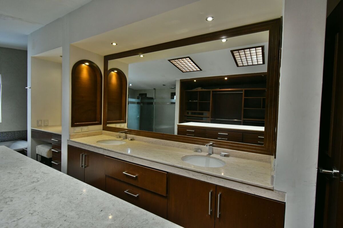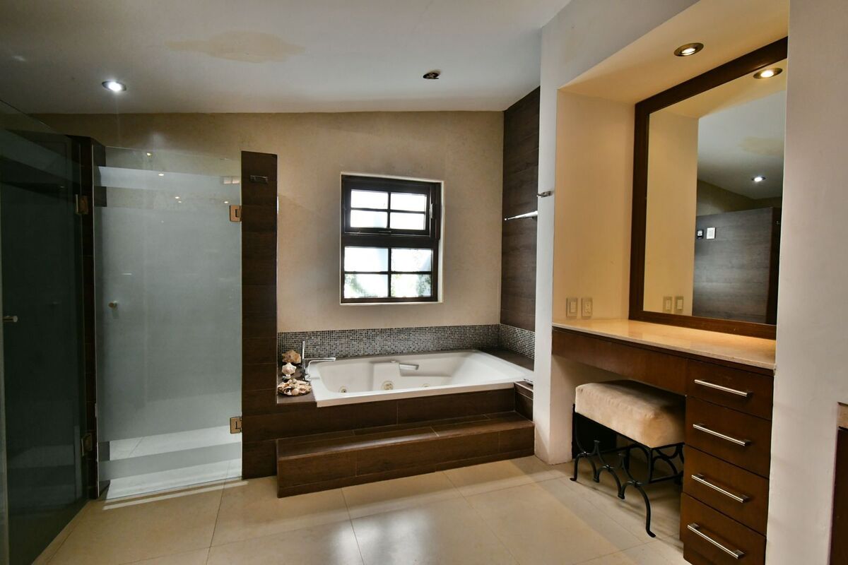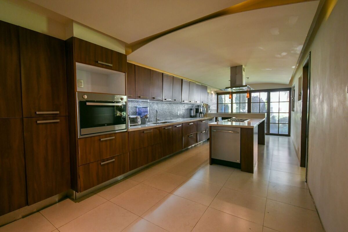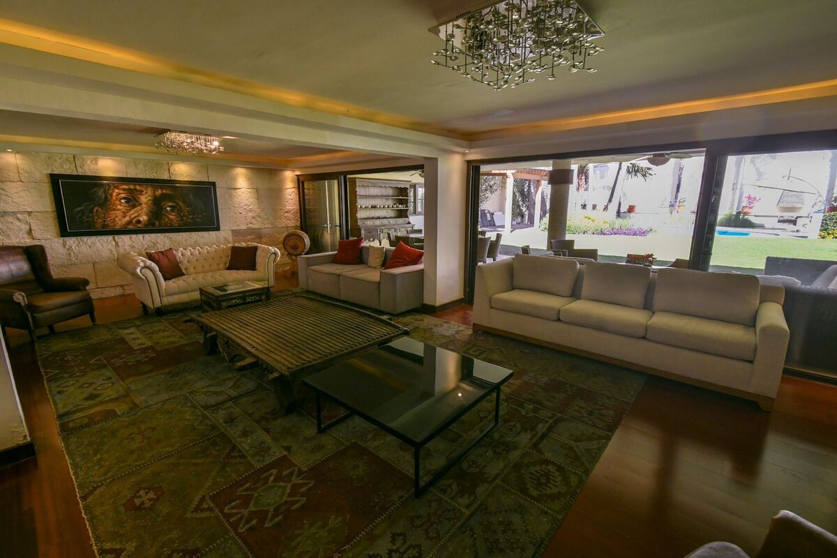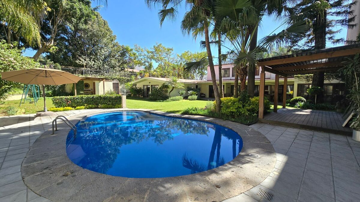 En planta baja tiene una amplia cocina con antecomedor cerca del jardín, comedor, sala, tres recámaras con baño completa cada una, estudio, alberca y baño para visitas. Así mismo cuenta con tres recámaras de servicio con un baño completo y cochera para 4 autos con portón eléctrico y ámplias áreas verdes.