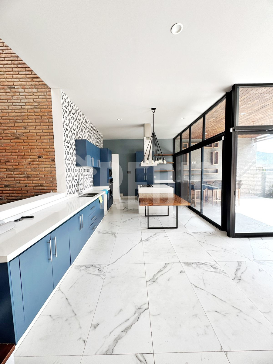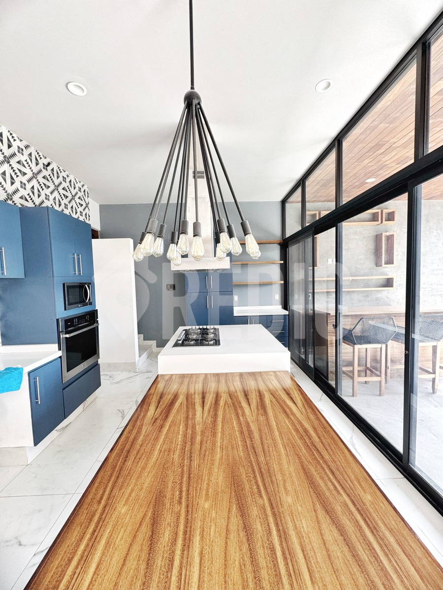 -Cocina equipada con campana, estufa, filtro de agua, horno, mesa de cocina de madera