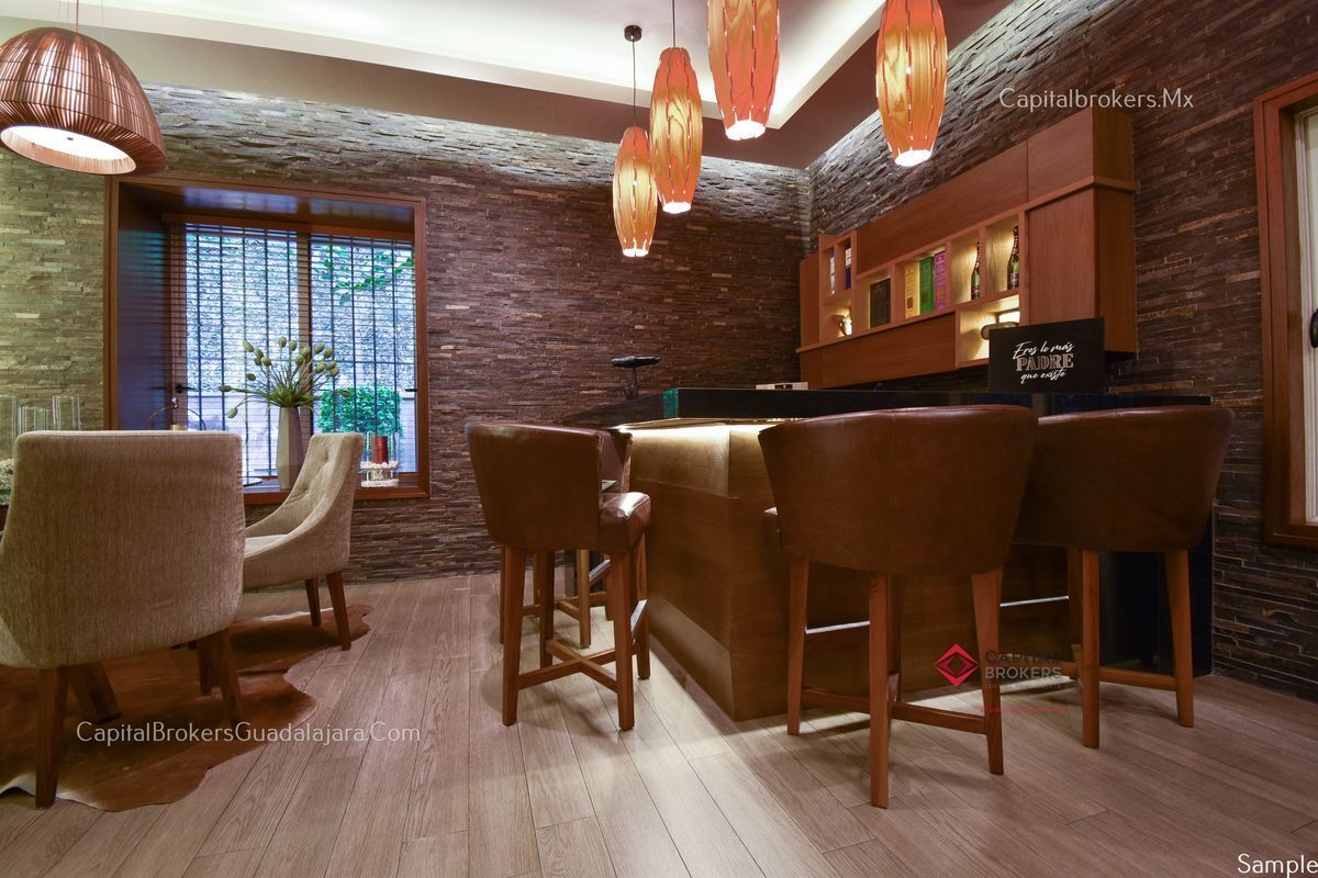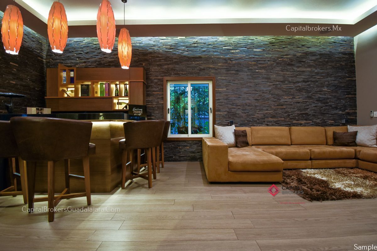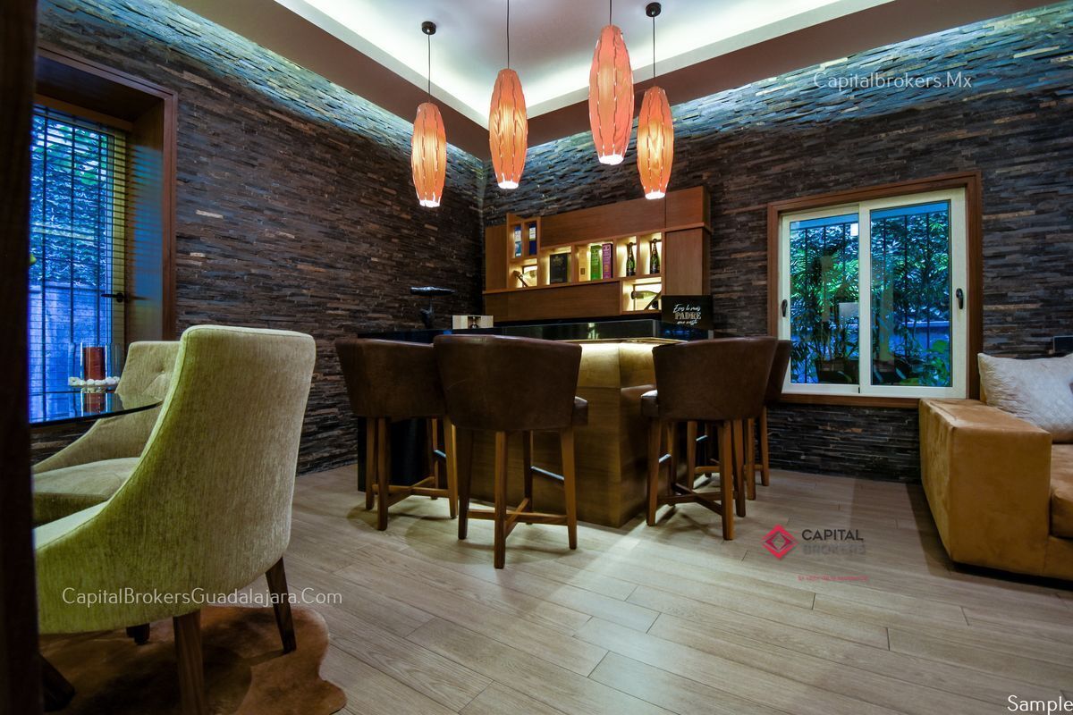 Con muebles empotrados, barra-bar grande de granito e instalaciones para música con entradas para varias bocinas.