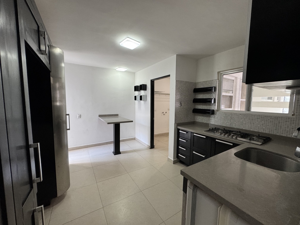 Tiene cocina integral que se conecta a la lavandería y al cuarto de servicio (también tiene entrada de servicio desde cochera) y medio baño de visitas