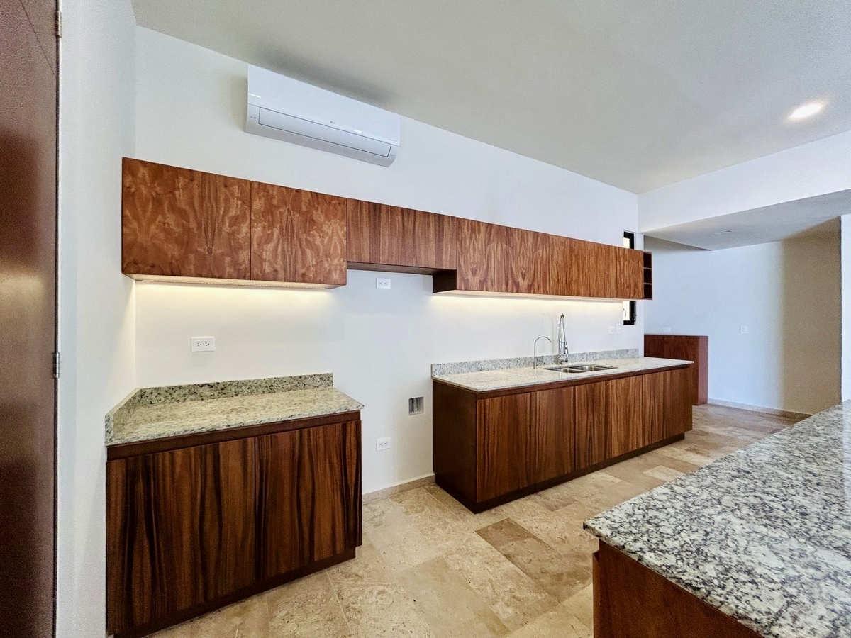 • Cocina equipada con isla, gavetas en madera, alacena y meseta de granito.