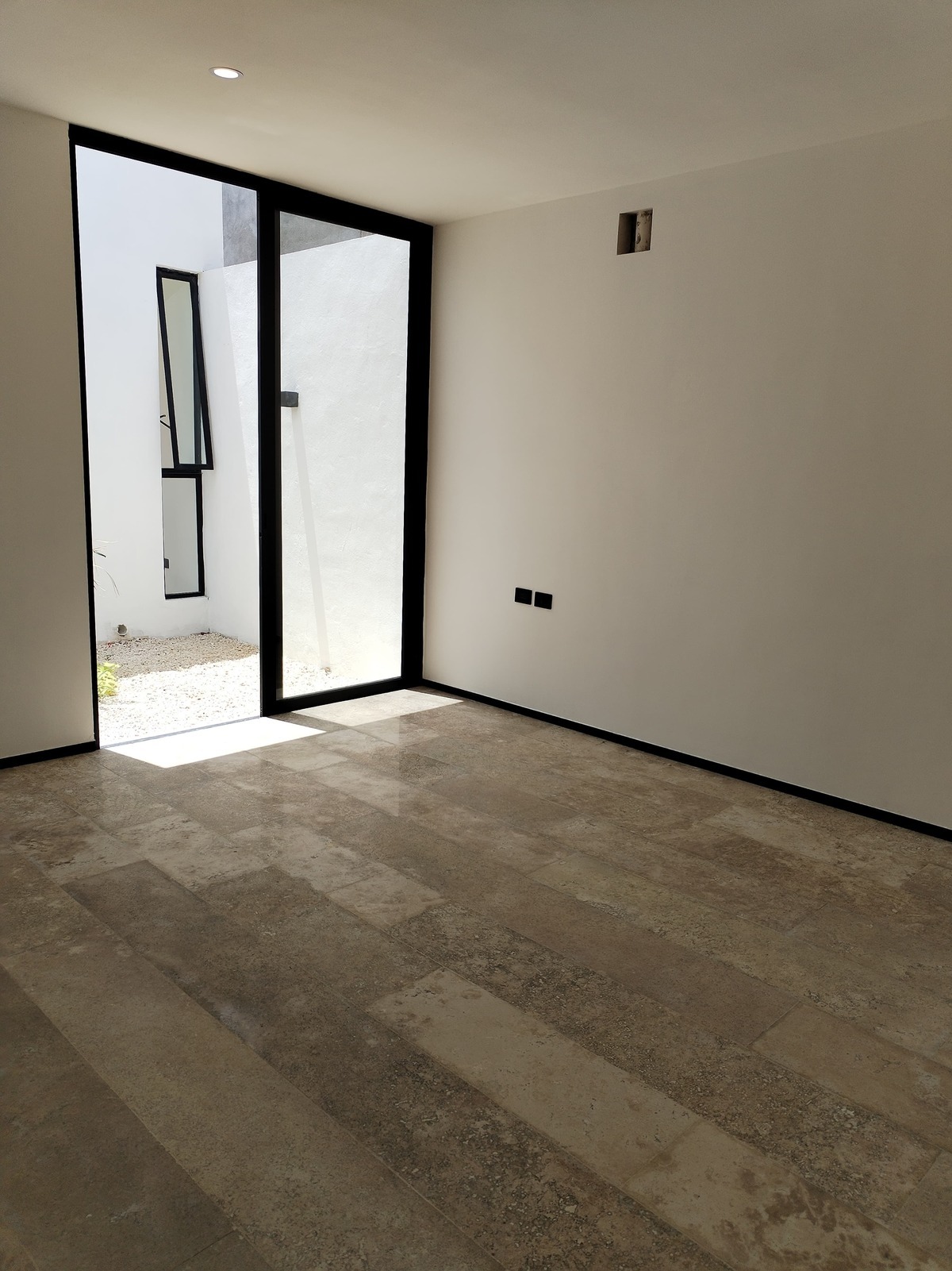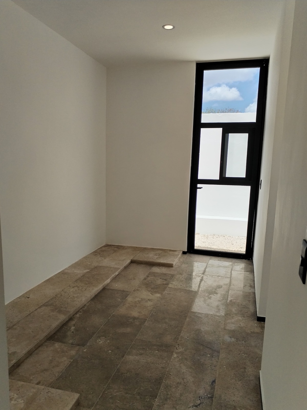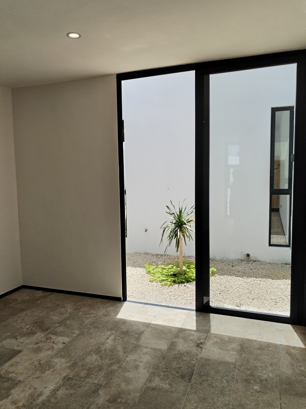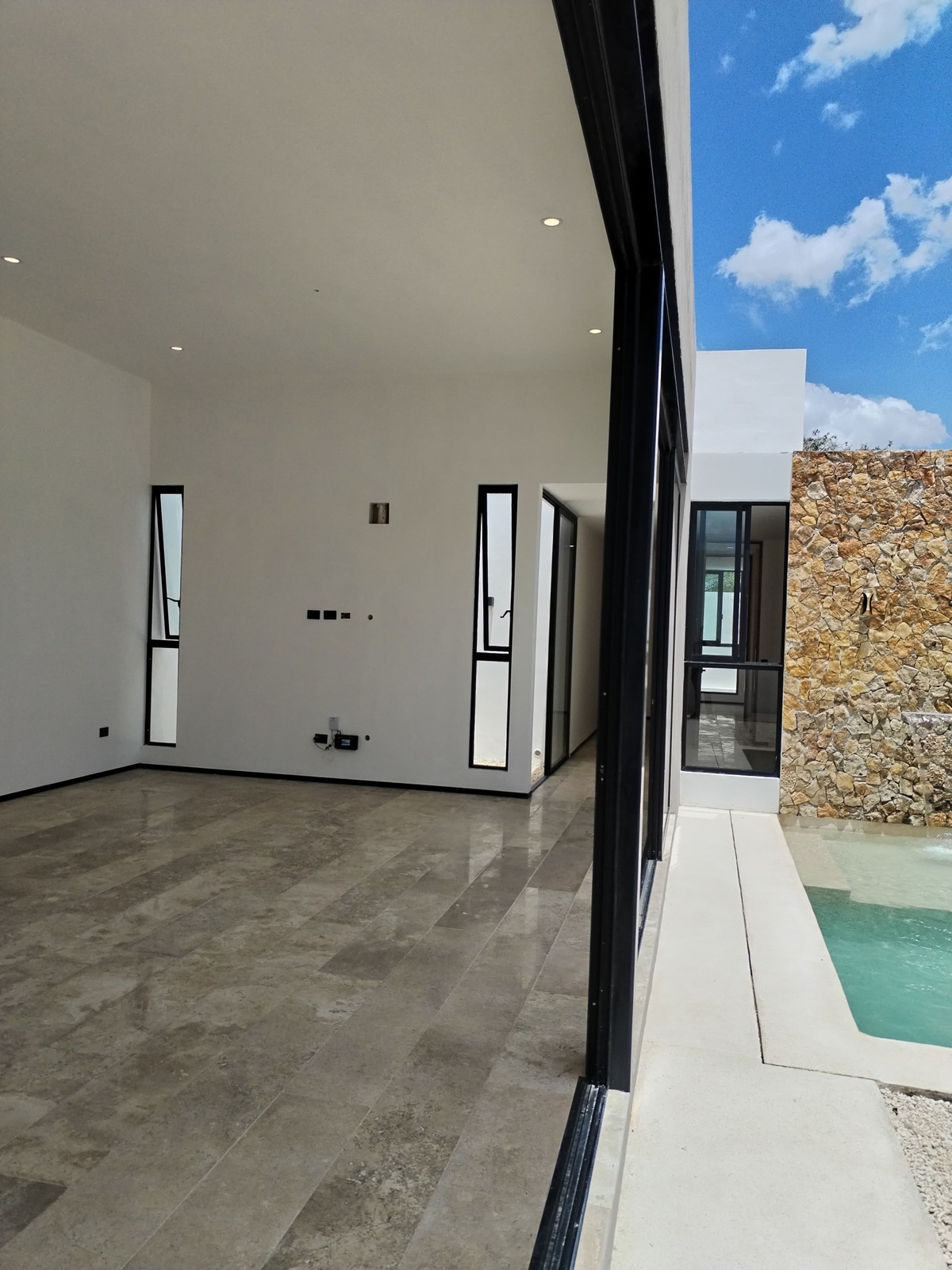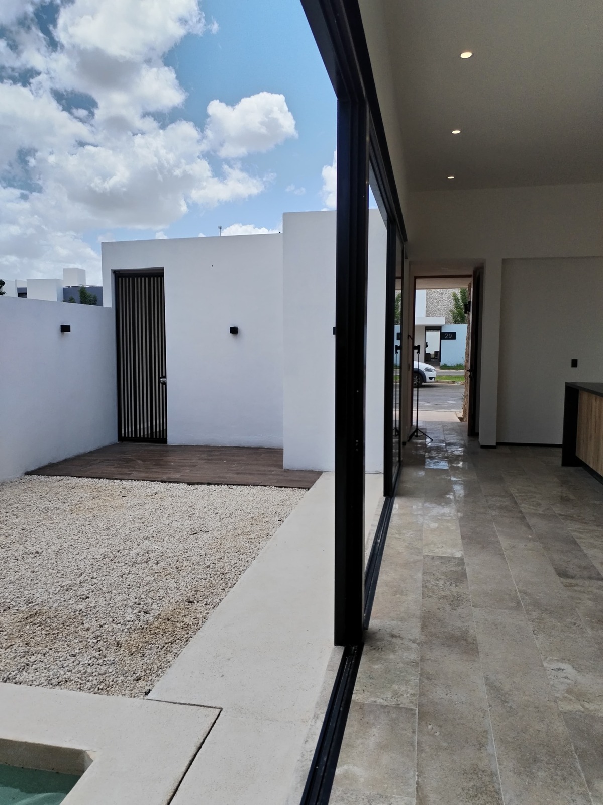 Casa de una planta con alberca y tres habitaciones en privada de Conkal con amenidades.